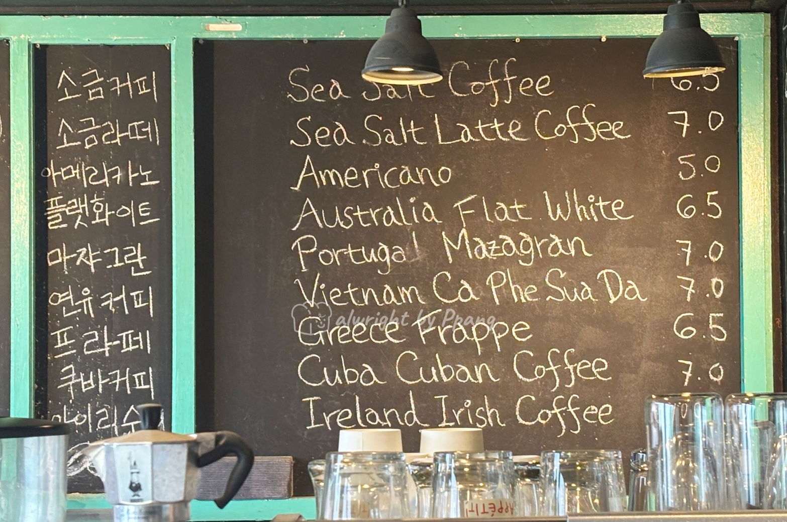 카페소금의 메뉴는 위와 같다. 소금커피, 소금라떼가 시그니처이고, 호주식 플랫 화이트, 포루투갈식 마쟈그란, 베트남 연유 커피, 그리스 프라페, 쿠바 커피, 아일리쉬 커피 등 각 나라 커피를 맛볼 수 있다.