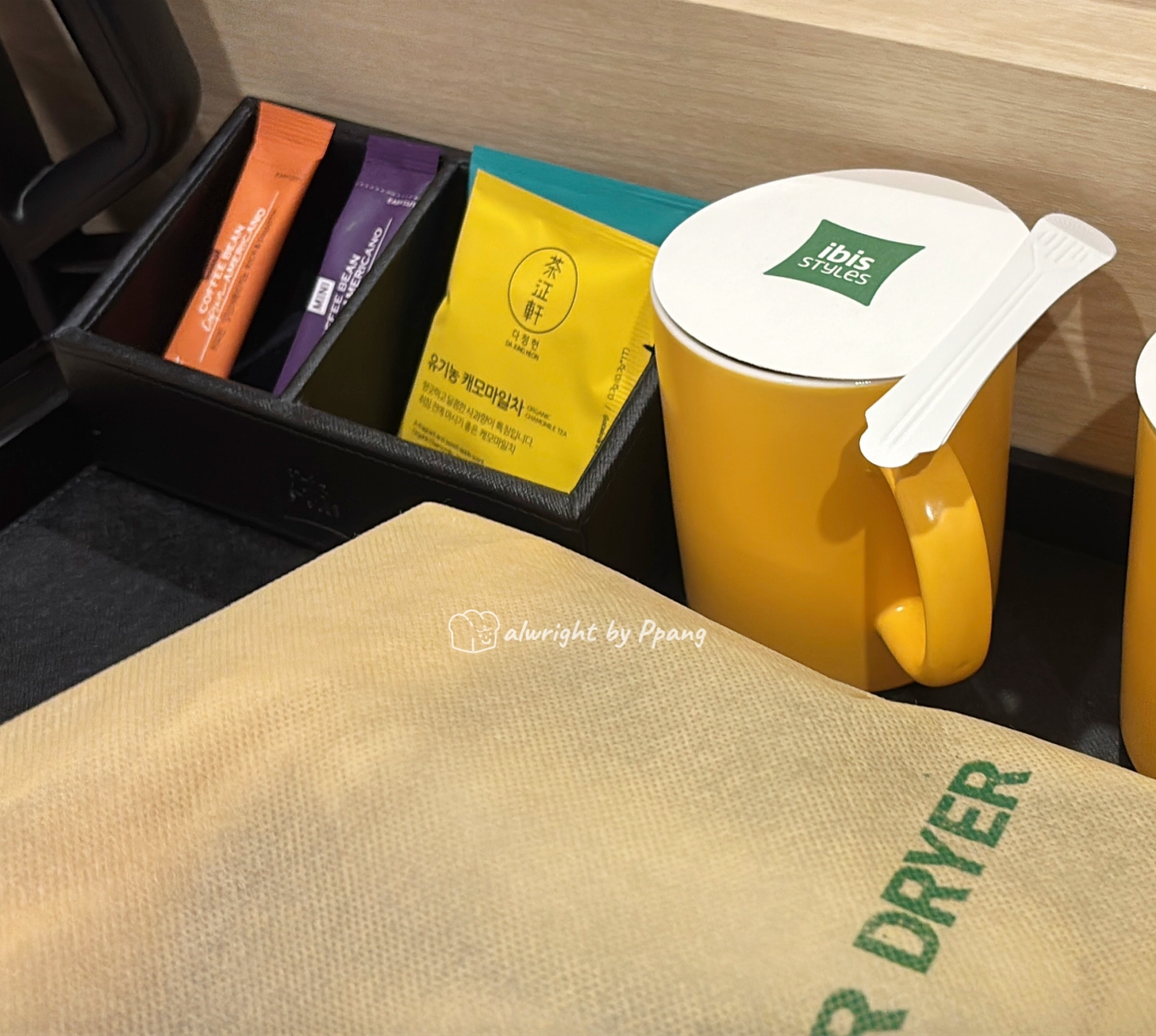 제공되는 어메니티는 생수 두병과 스틱 커피, 차가 두 종류 이다.