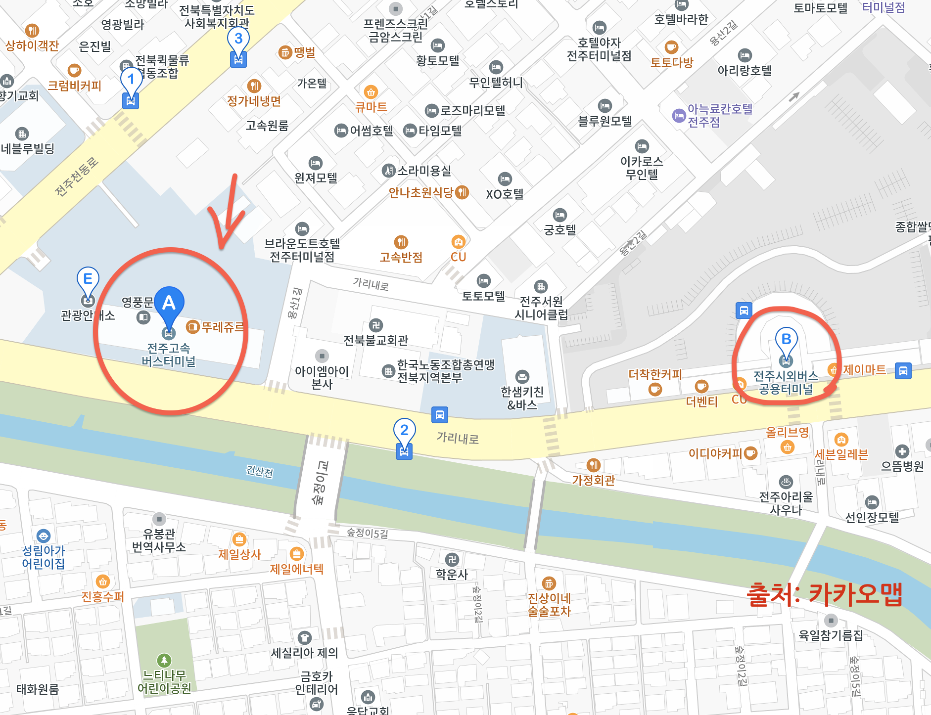 지난 전주 여행에서는 영화의거리에서 전주고속터미널 까지 걸어보았다. 동네 구경하면서 한 40분쯤 걸렸나? 이제는 날씨가 더워지고 있으니 버스나 택시를 타기를 권한다. 이참에 위치와 시설, 정보를 정리해 보았다.