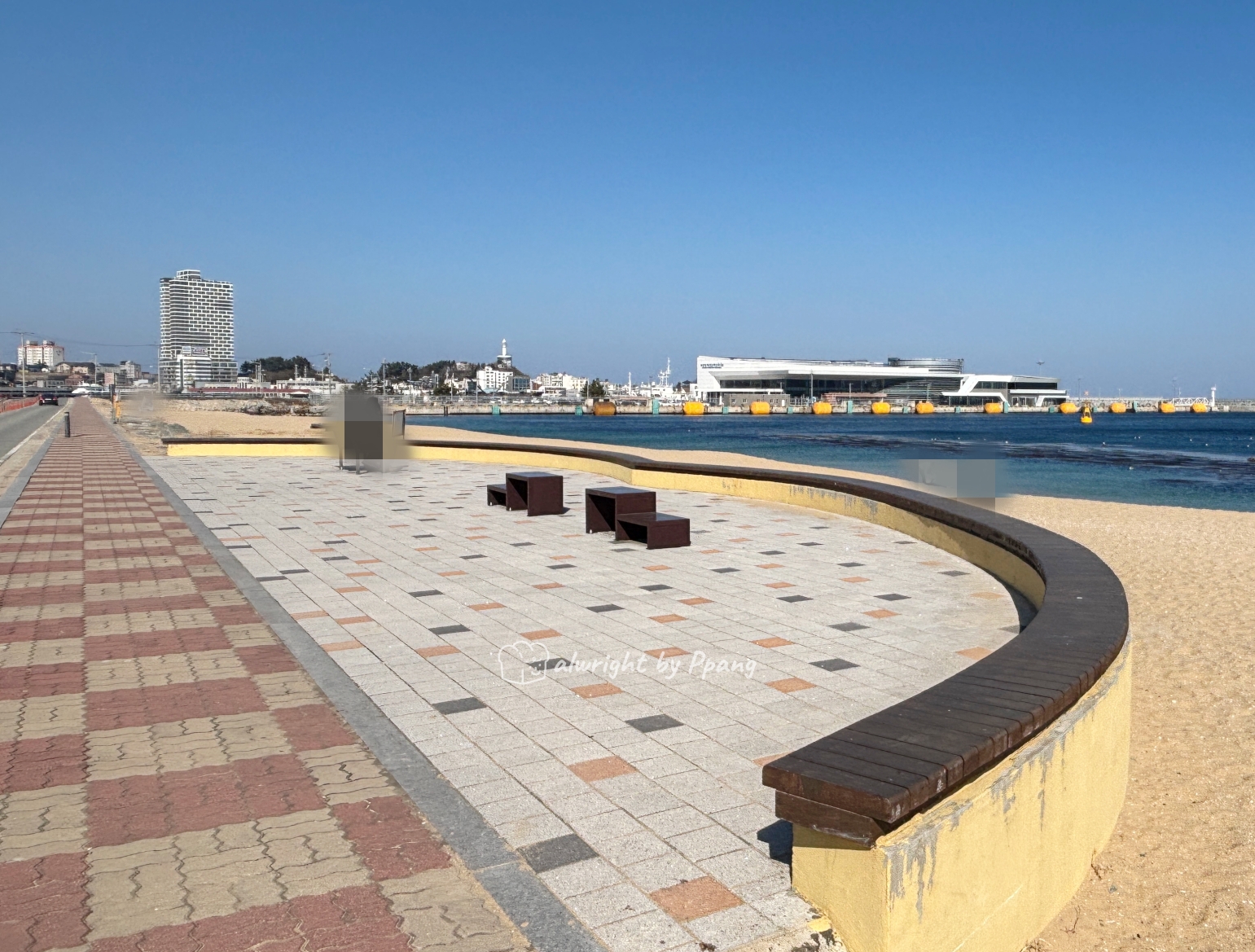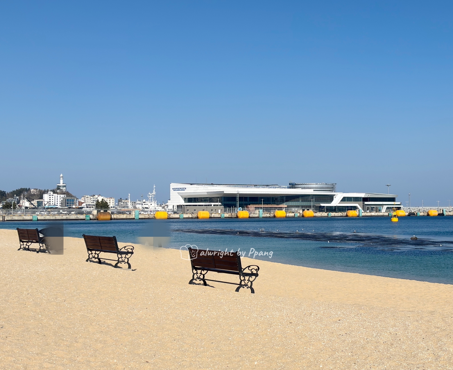 바다 저쪽에 속초항 국제 크루즈터미널이 있다. 바다색이 너무 파래서 가짜로 그려 놓은 것 같다.
