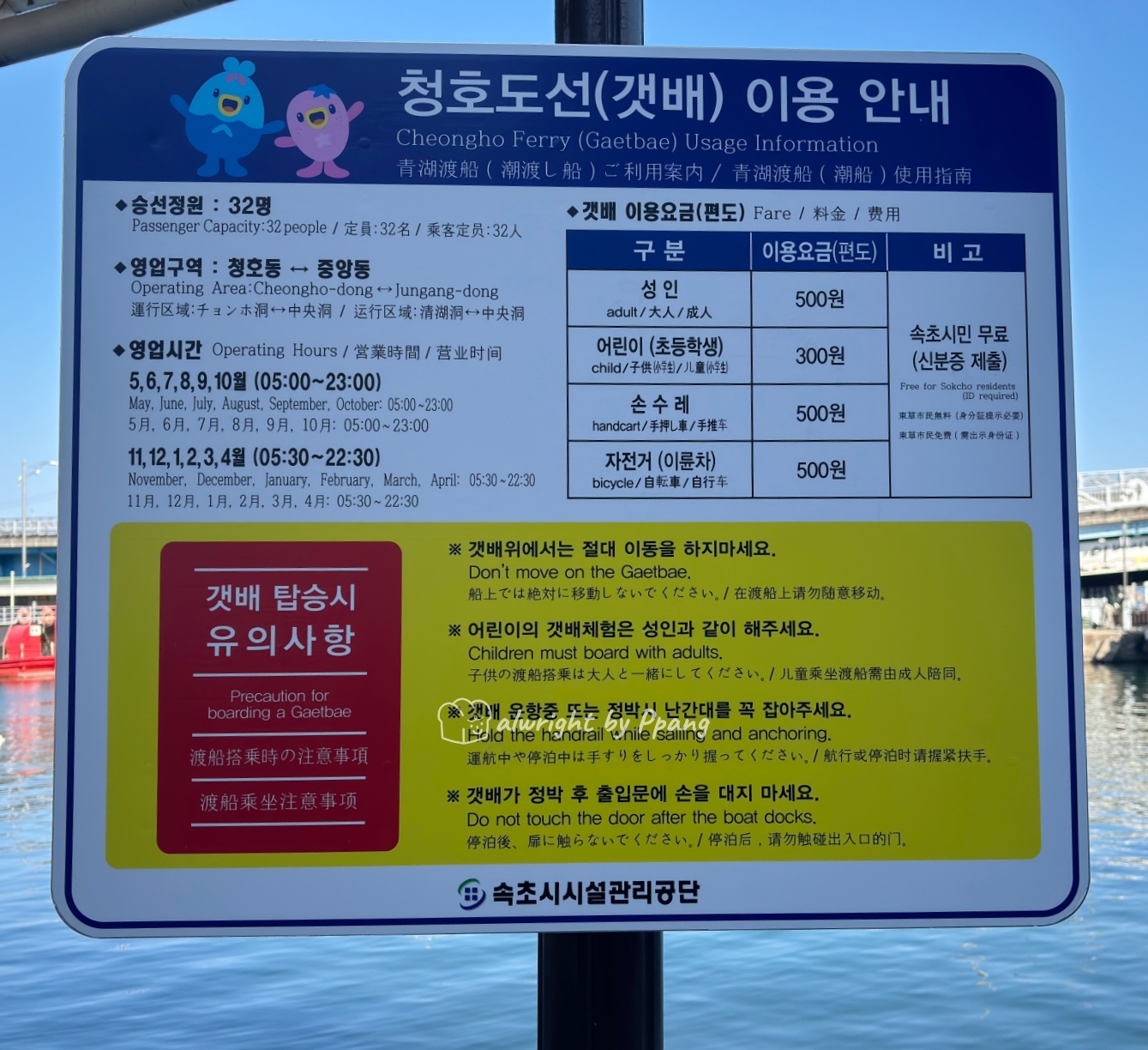 아바이마을 갯배 이름은 청호도선, 성인 500원, 어린이 300원, 손수레와 자전거는 500원, 속초시민(신분증 지참)은 무료다.