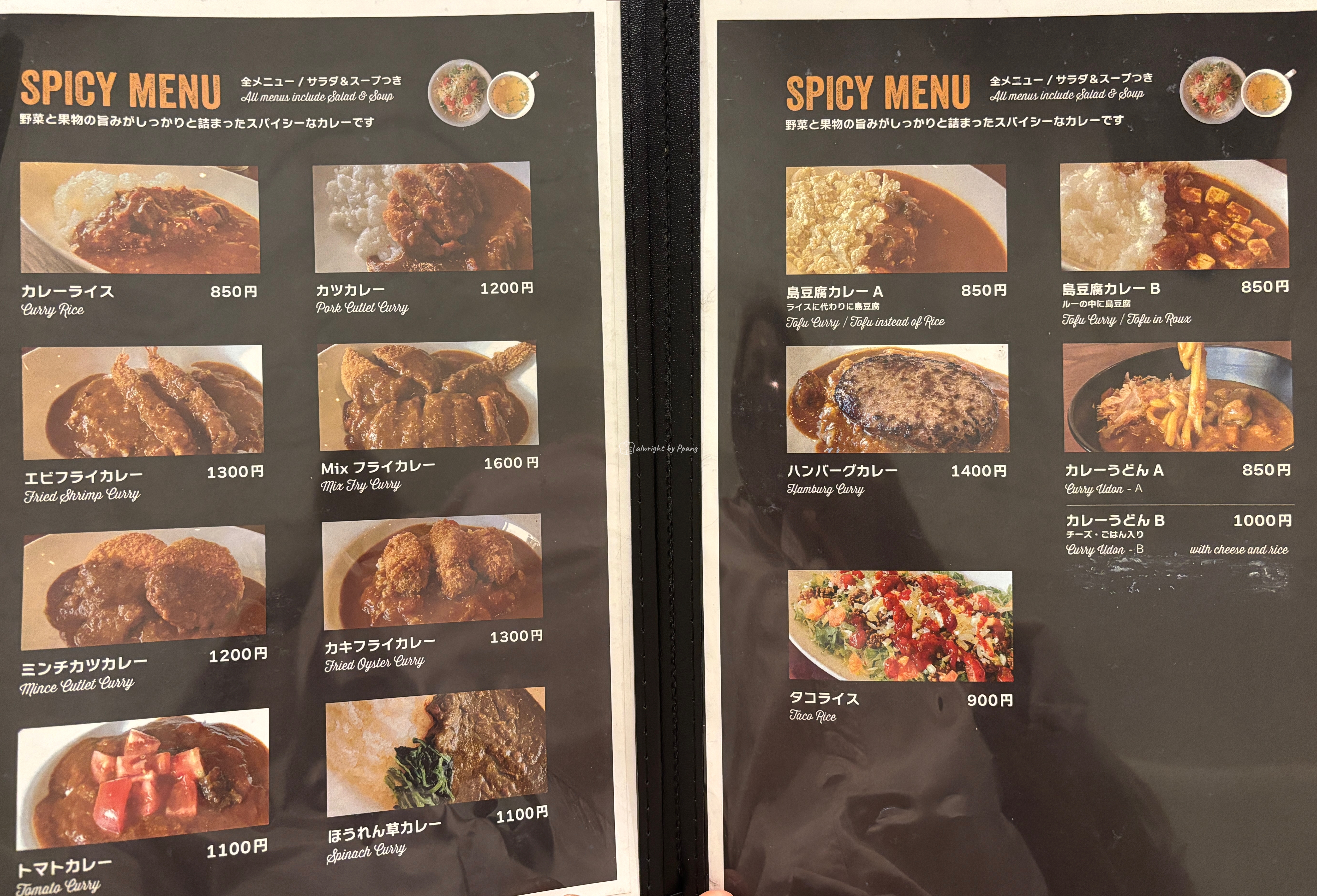커리라이스, 돈가츠커리, 새우튀김커리, 햄버거스테이크 커리...등이 있고, 두부커리, 타코라이스, 커리우동 등 한국커리 집에서는 보기 힘든 메뉴도 있다.