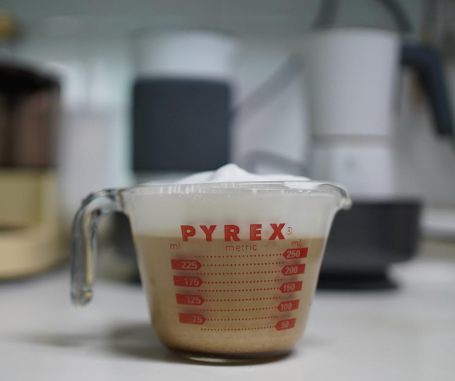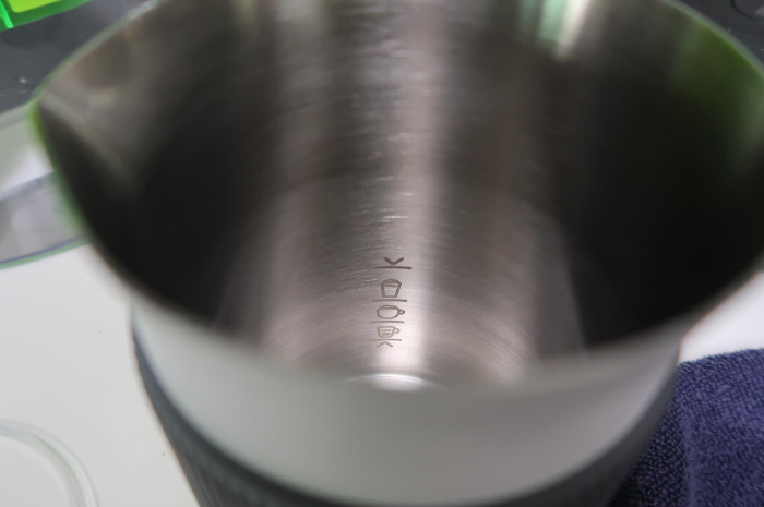 우유거품기 안쪽에는 라떼용, 카푸치노용, 우유거품용 우유 양 표시가 되어 있다.
