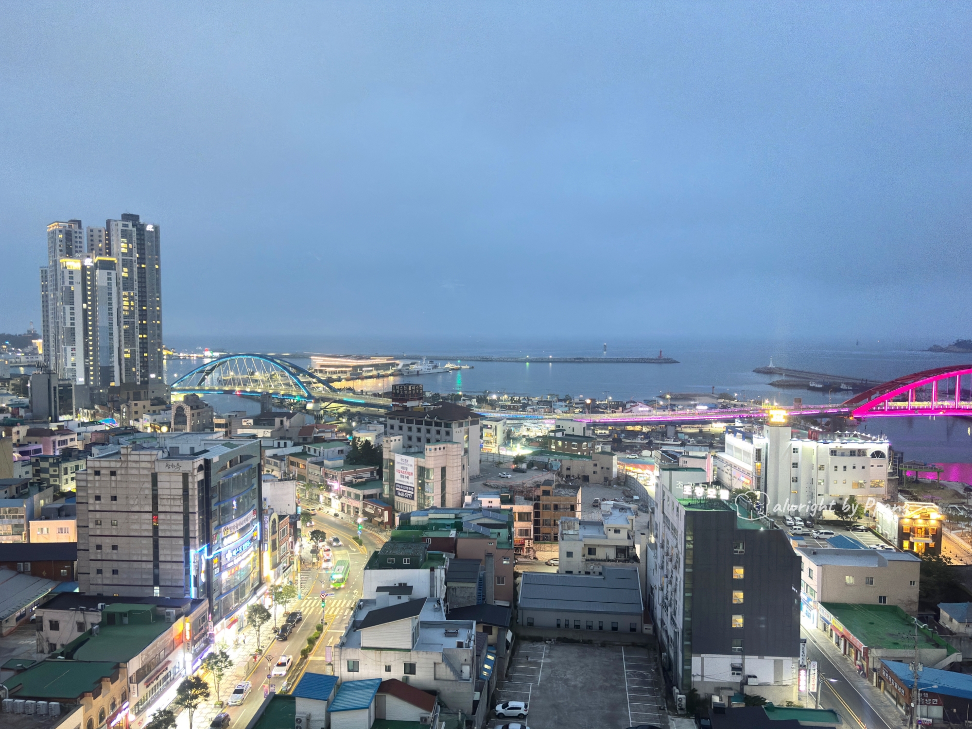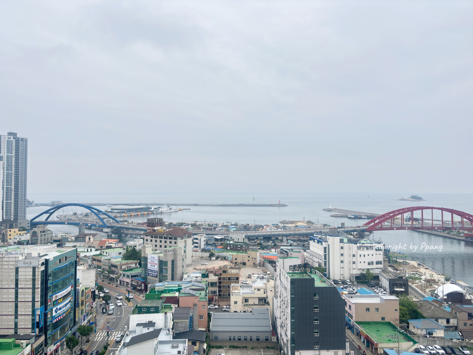 바다가 보이는데 망망대해 오션뷰는 아니고 금강대교와 설악대교가 나란히 보이고, 속초항과 아바이마을이 보이는 바닷가 뷰이다.