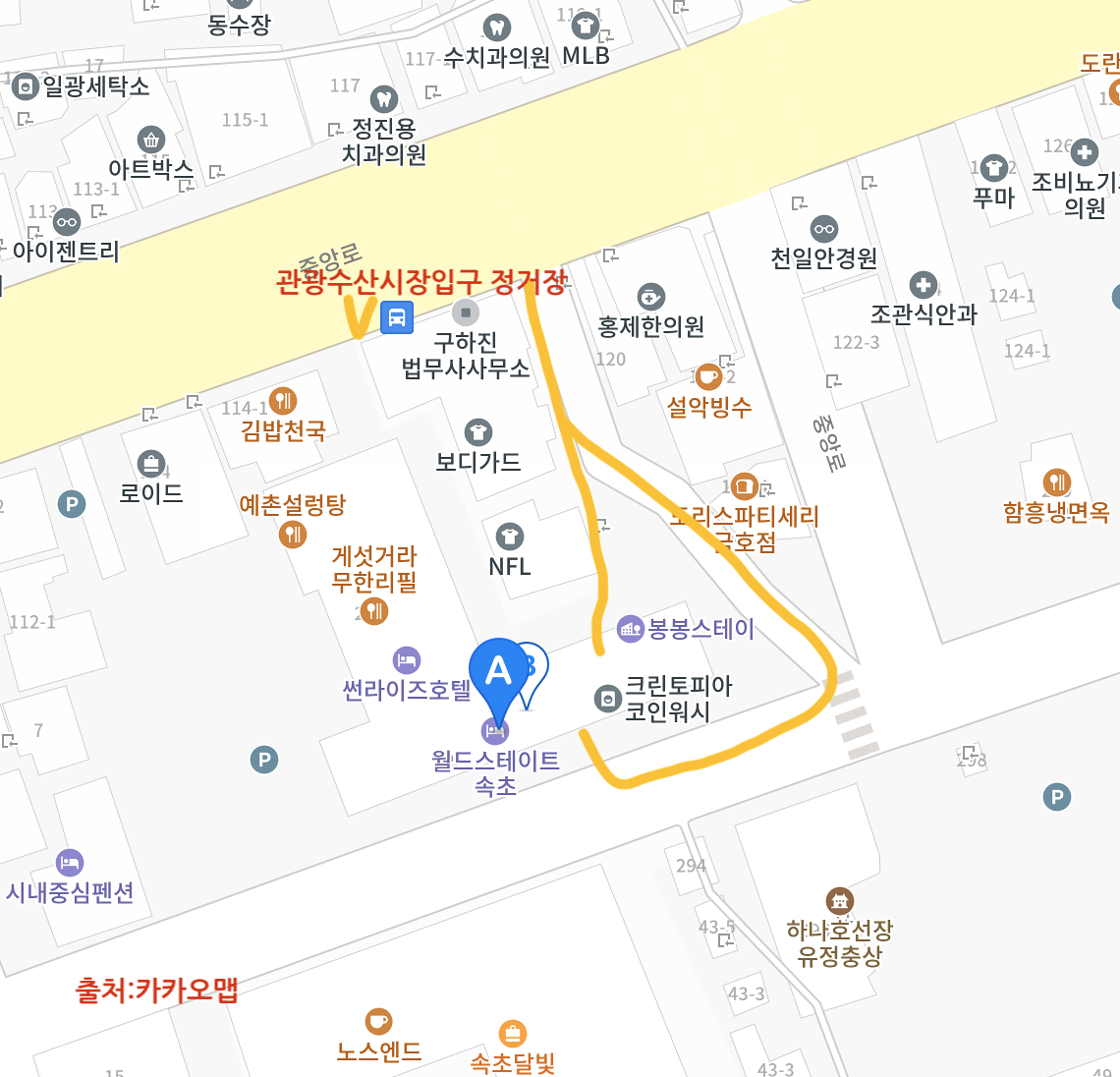 그래서 말인데 월드스테이트 간판이 어디에도 보이지 않는다. 주소를 검색하면 썬라이즈호텔로 안내해 준다. 지도 보고 썬라이즈호텔에 도착했다면 잘 간 거다.