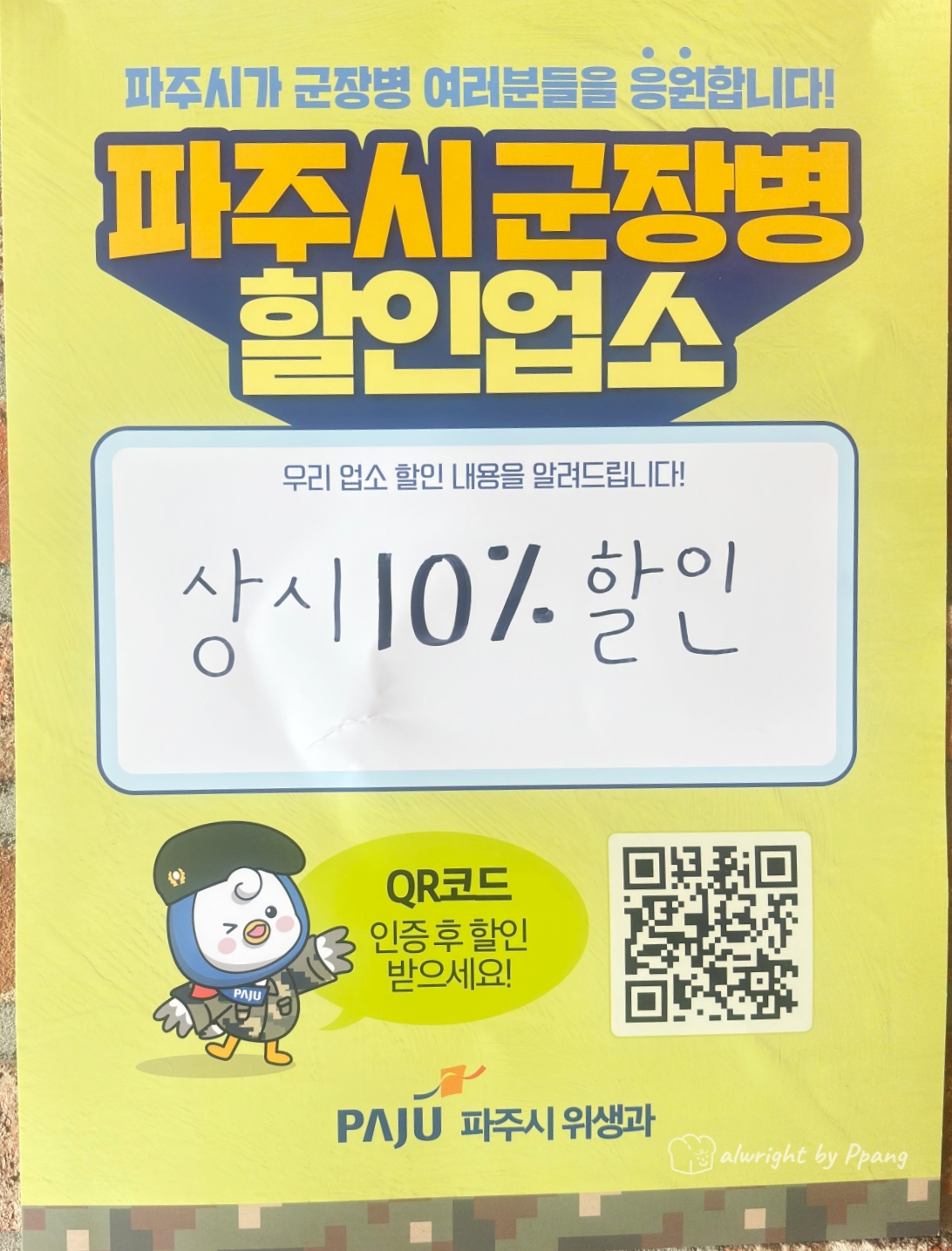 군인도 환영한다. 근처에 군부대가 있어서 그런지 파주 업장 중에는 요렇게 군인 할인 되는 곳들이 꽤 있다.