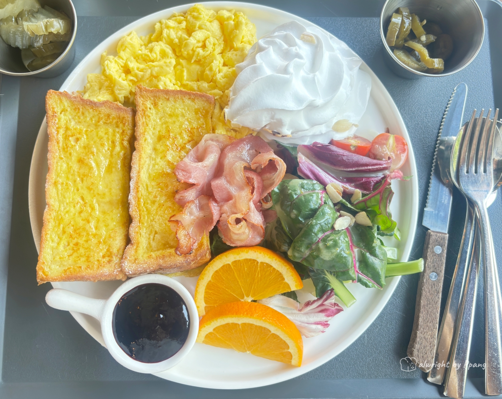 여튼 두툼한 식빵에 계란물 들인 프렌치토스트와 샐러드, 베이컨, 스크램블드에그가 나온다. 생크림과 잼이 빵 대비 넘 많이 나와서 잼 남기고 온 게 아깝다. 잼이 맛있었는데.