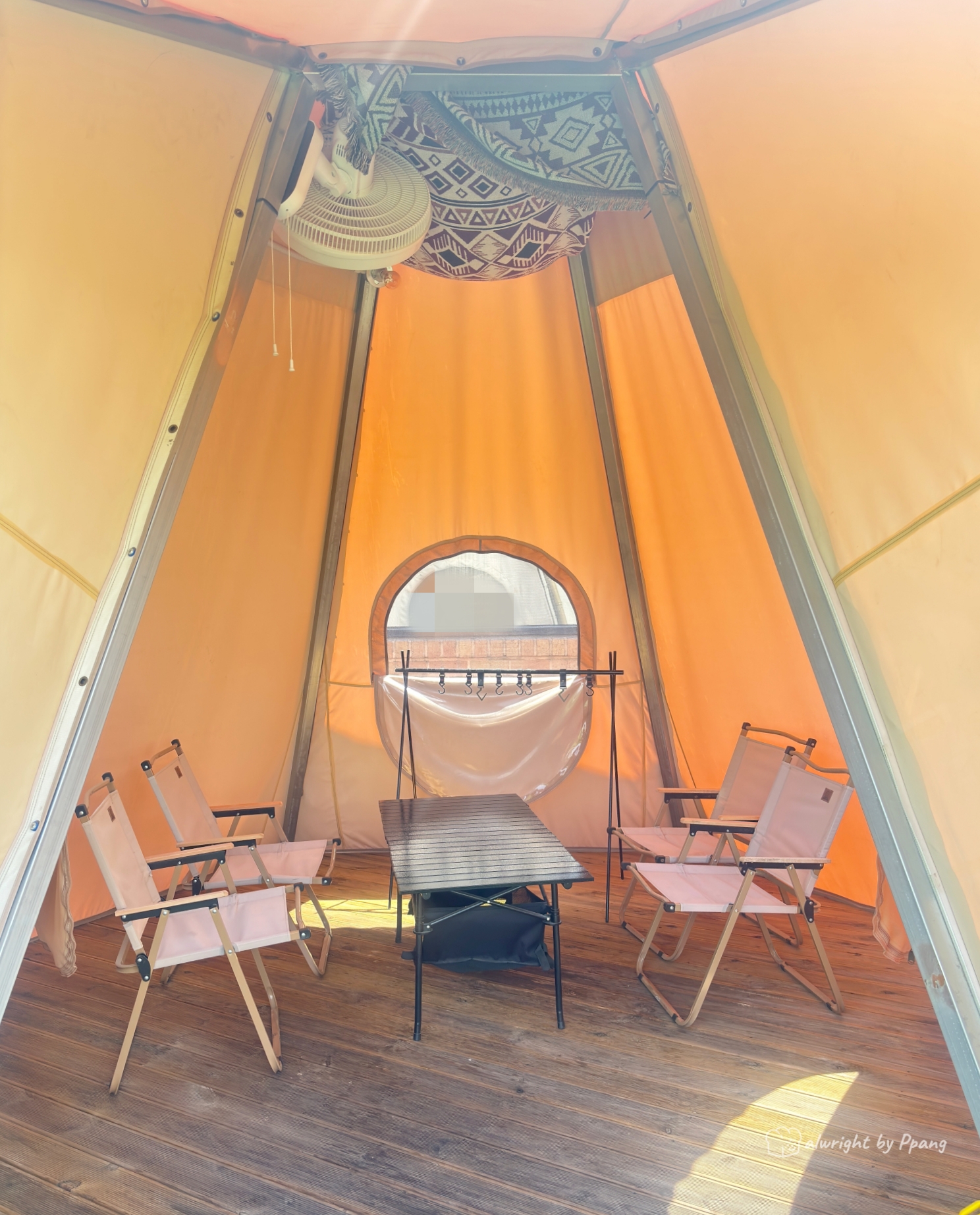 텐트는 이렇게 꾸며져 있고, 선풍기가 설치되어 있다.
