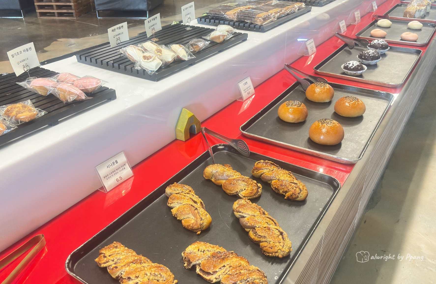 빵 매대도 커서 한 컷에 다 안 담긴다. 식사빵, 후식빵, 케이크, 쿠키 등 빵 종류도 많다. 가격이 저렴하지는 않다.