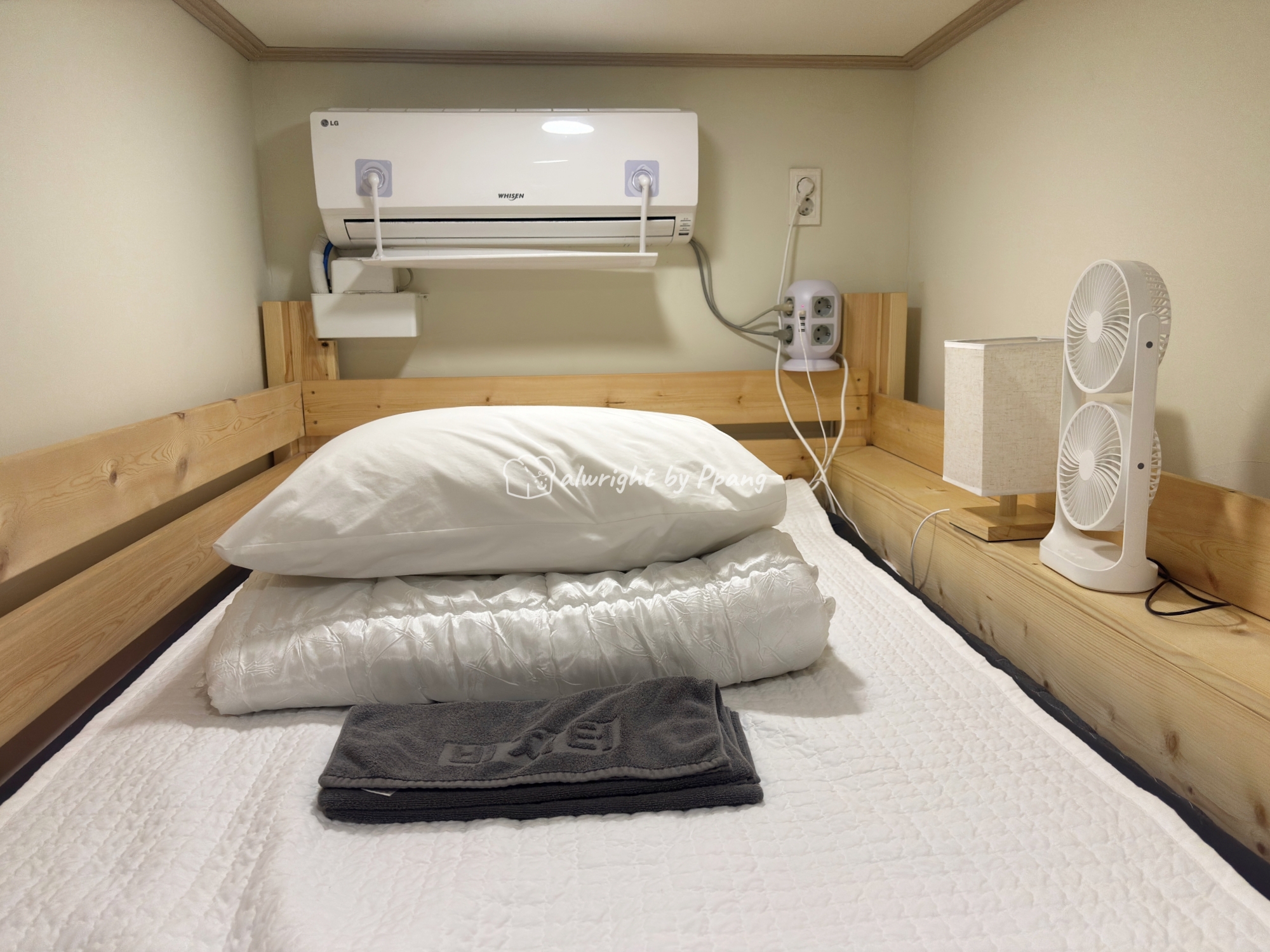 벙커침대의 2층은 침실이다. 머리 위에 에어콘이 있는데 에어콘이 부담스러운 사람(나 같은)을 위해 선풍기도 있다.