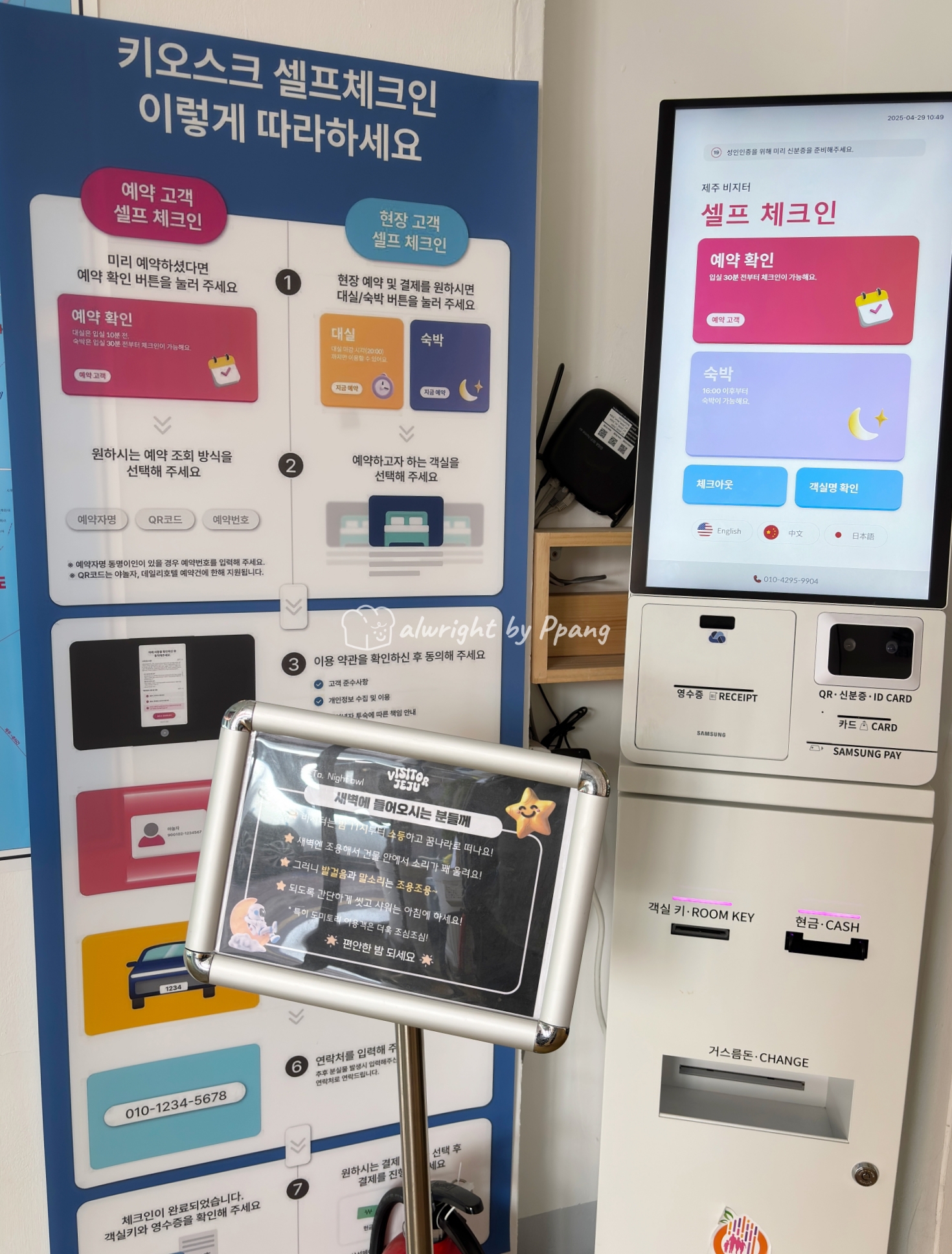 키오스크로 체크인도하고 체크아웃도 하지만 2층에는 사실 프론트데스크가 있다. 그니까 1층에서 하다하다 정 안되면 나와 있는 번호로 전화하면 된다.