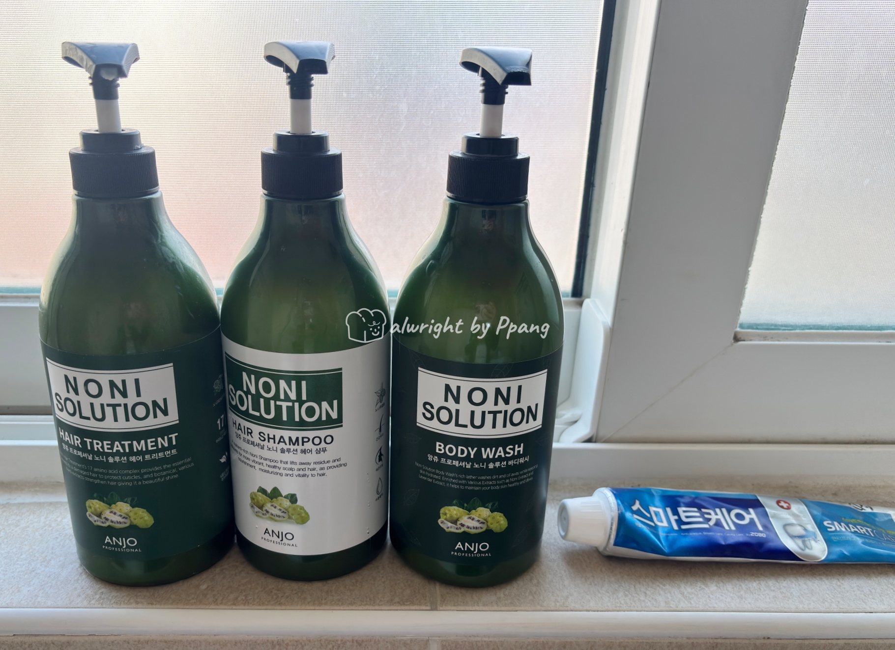 화장실 겸 샤워실에는 샴푸, 트리트먼트, 바디워시, 치약이 있고, 세면대 쪽으로 핸드워시가 있다.