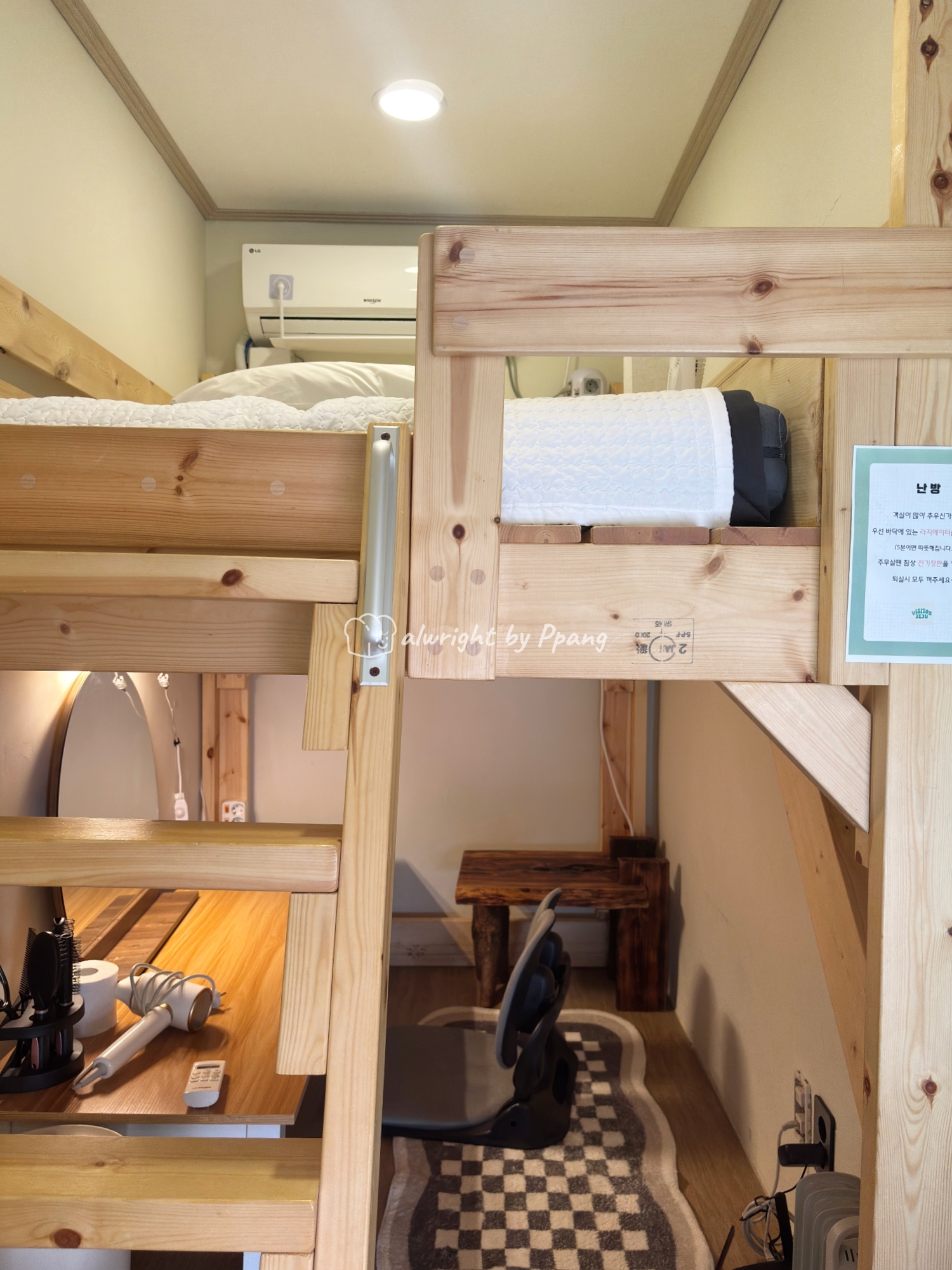 아랫층에는 낮은 책상과 의자가가 있다. 책상 위에 거울과 드라이기, 빗 등이 있어서 화장대 겸용으로 사용할 수 있겠다.