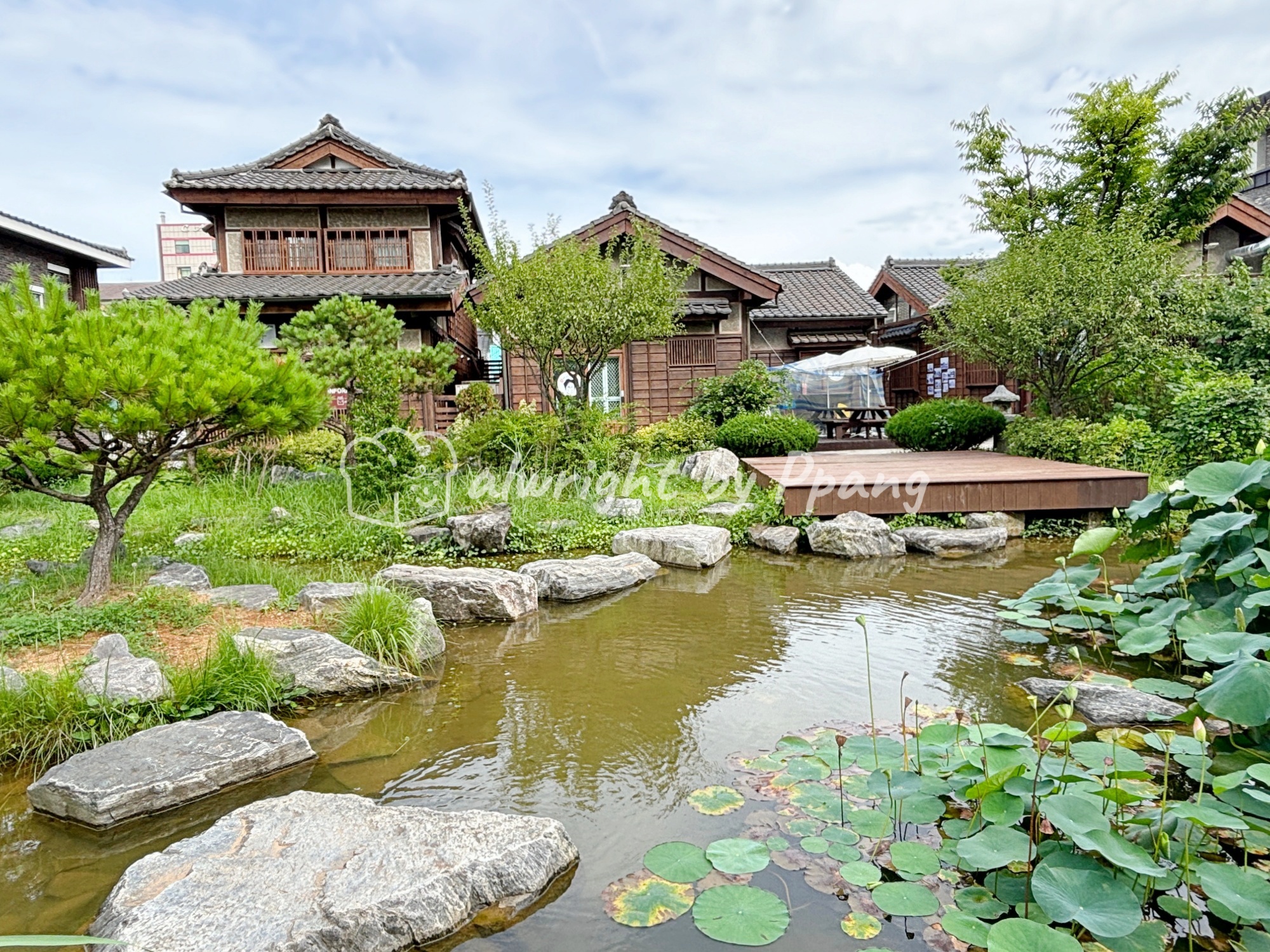 전체적으로 ㅁ 자 모양이고, 가운데 얕은 인공 연못이 있다.