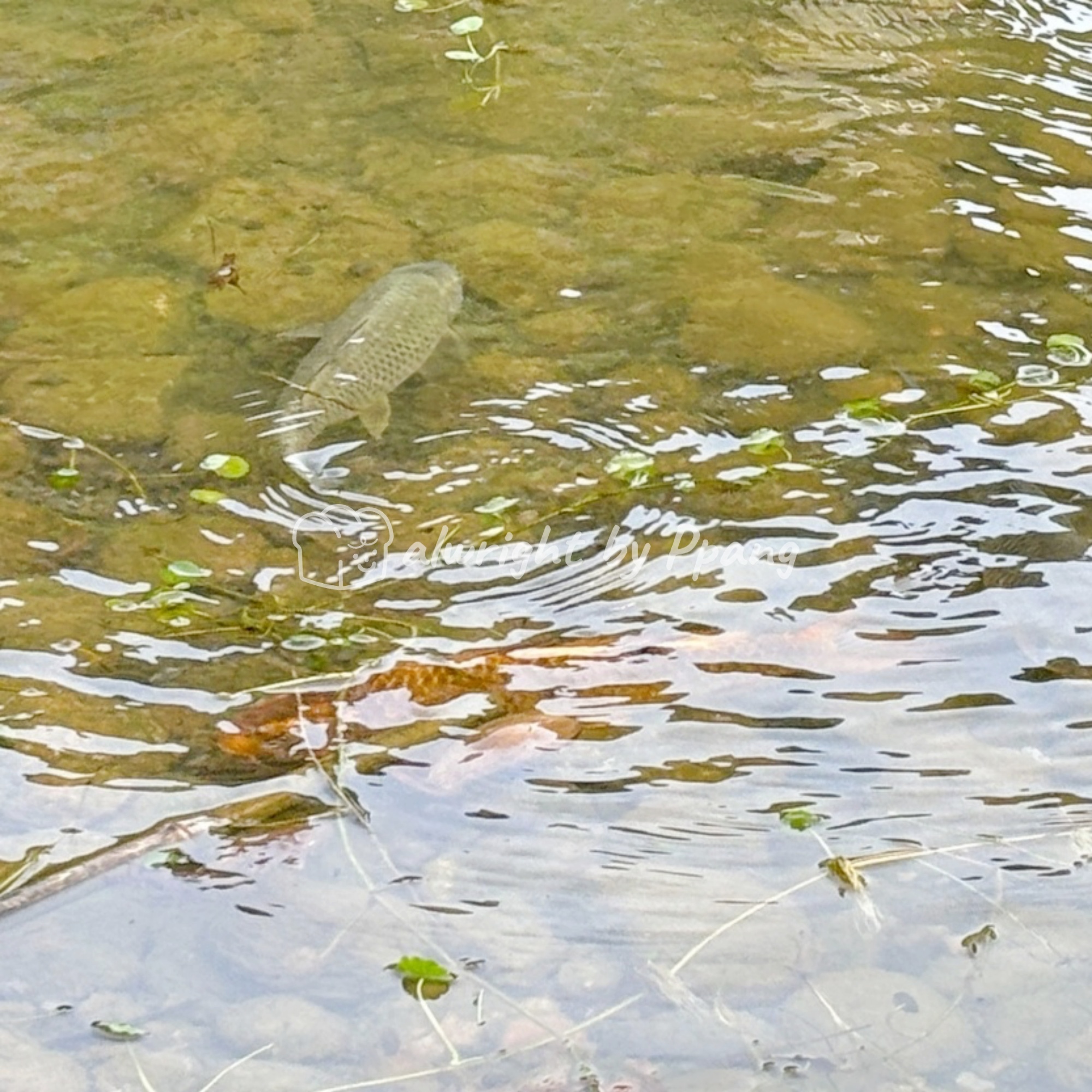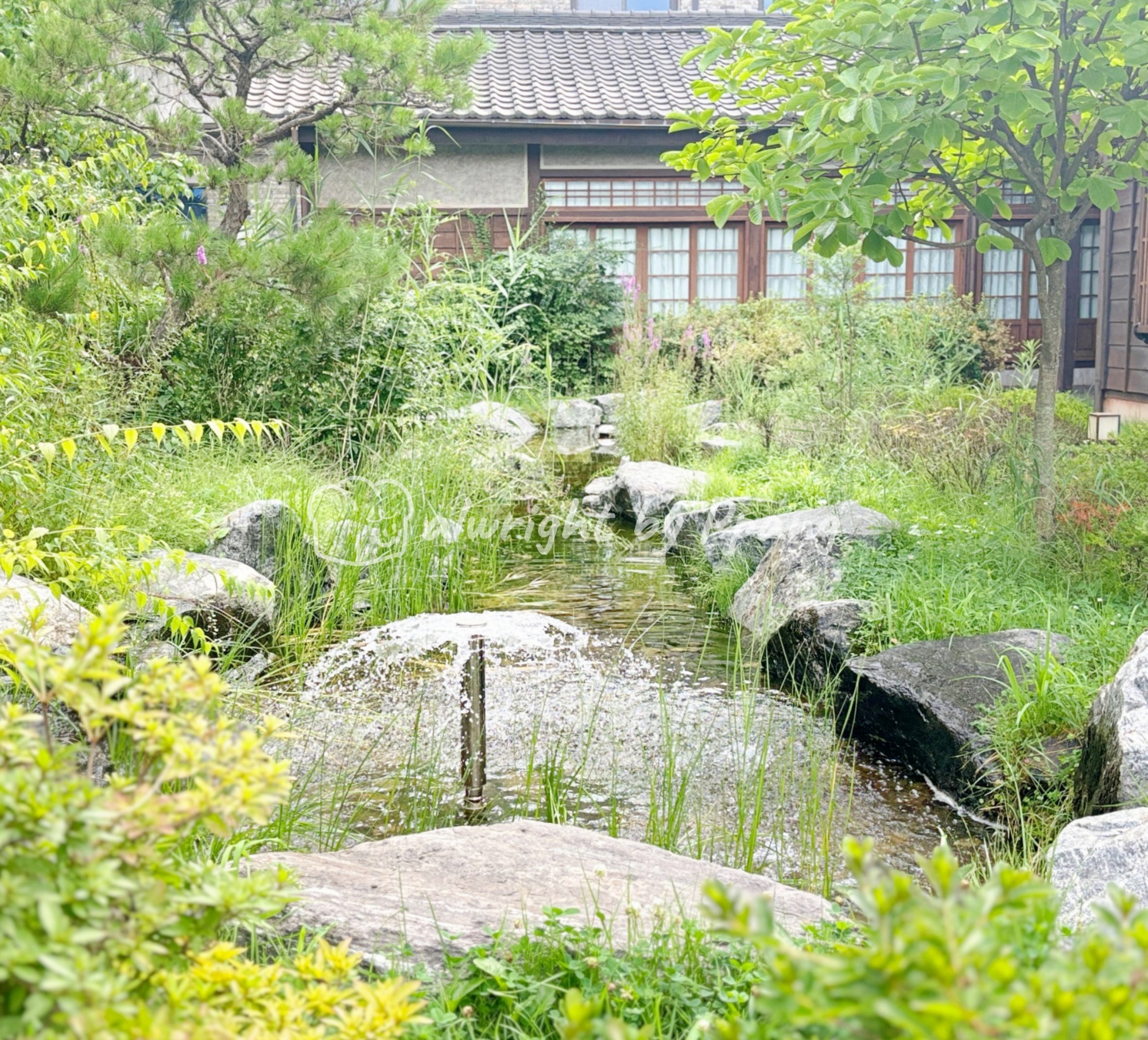 창 밖으로는 다른 숙박동과 가운데 연못이 보이는데 카페를 이용하는 손님들도 이 정원을 구경하러 숙박 바운더리로 들어온다.