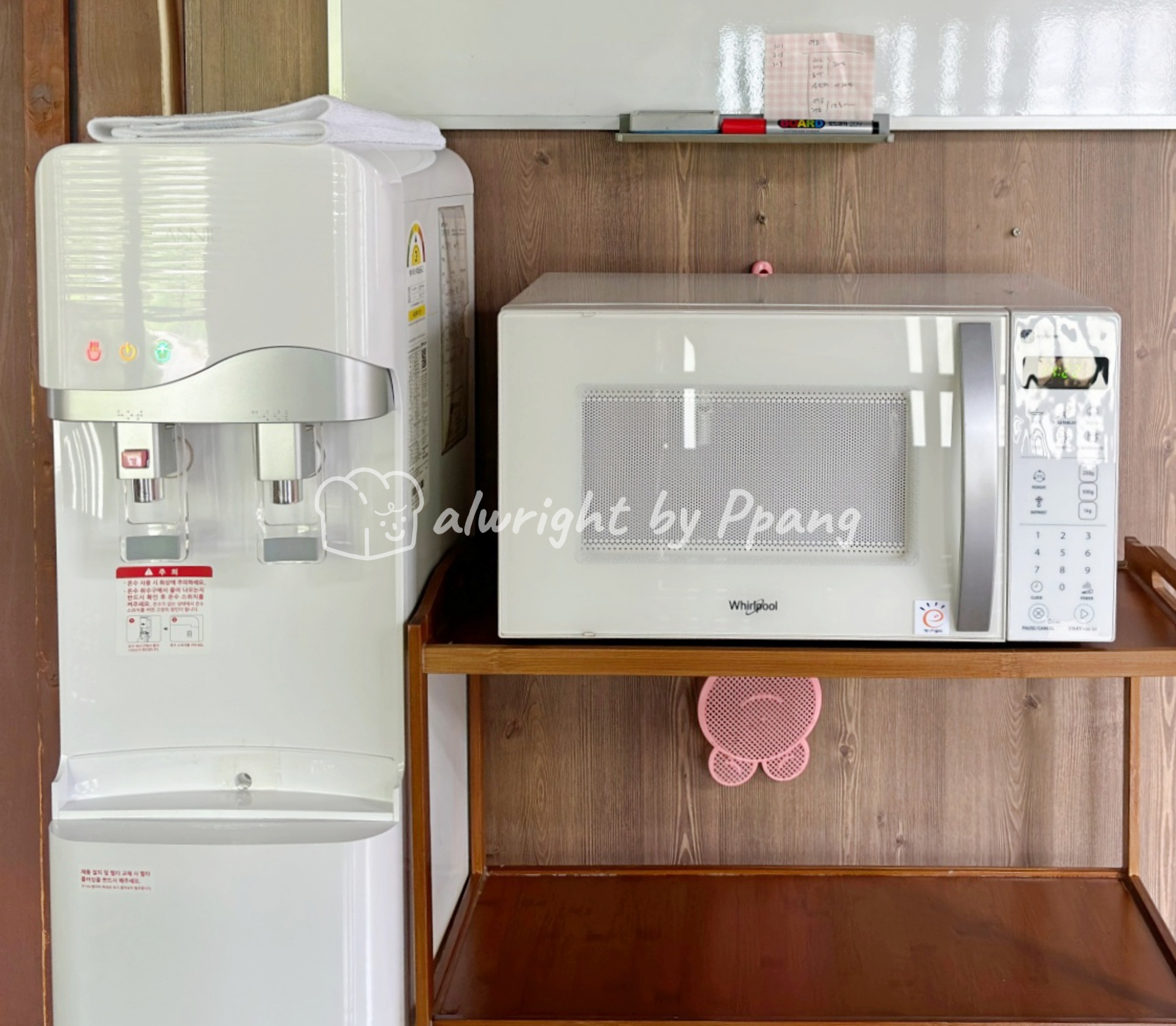 가을동 복도 가운데에는 정수기와 전자렌지가 있어서 간단히 무언가를 데워 먹을 수 있다. 다만 객실 다다미에 음식을 흘리게 되면 좀 곤란한 상황이 발생할 수 있다.