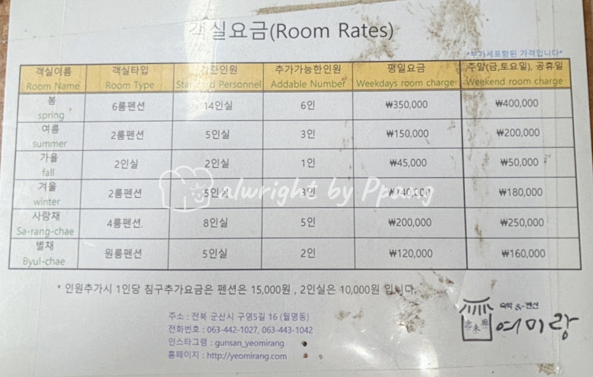 성수기일 경우 위 금액표에서 약간 인상된다.