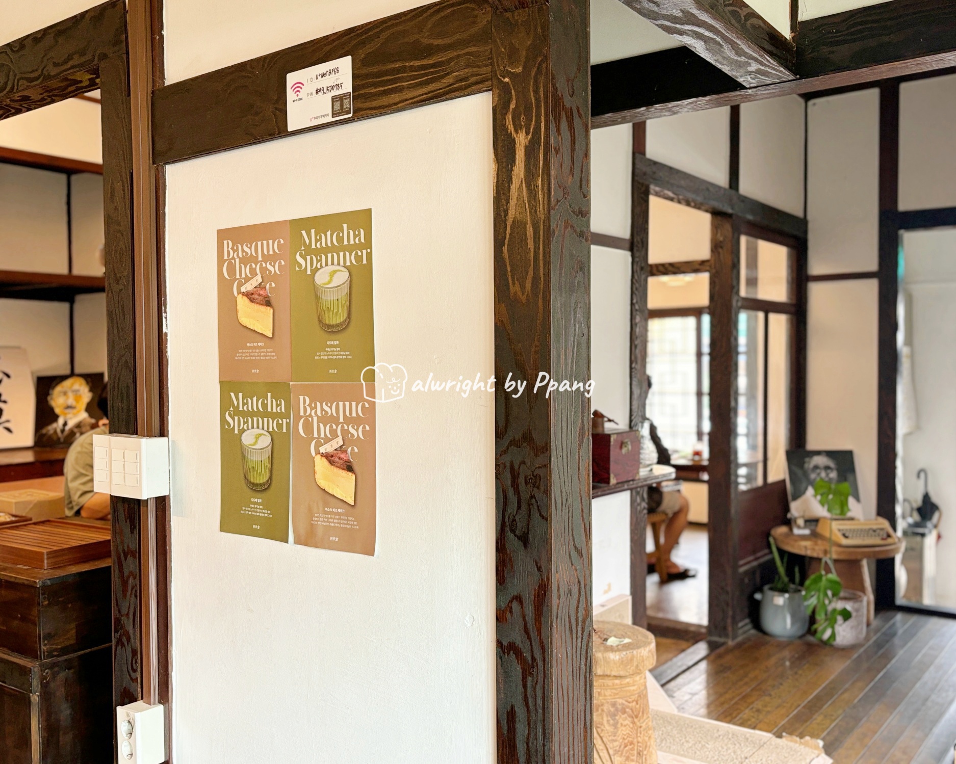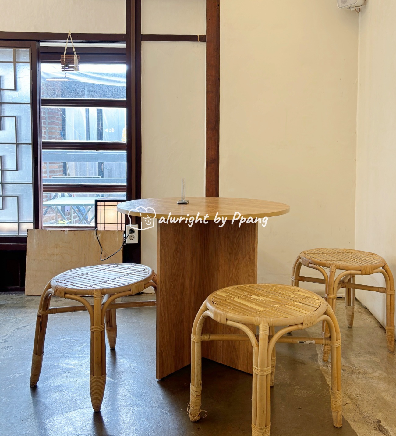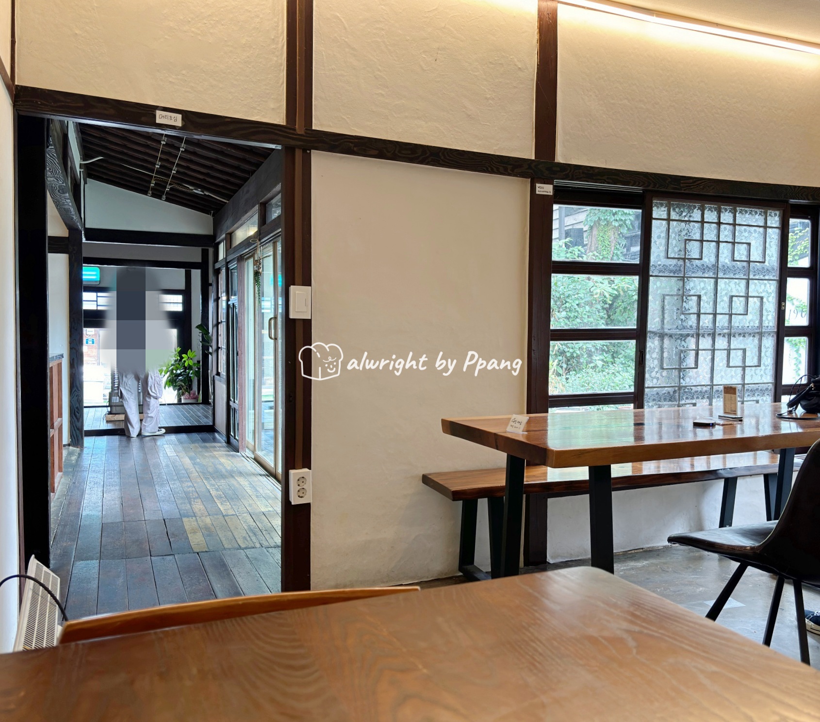 짙은색 나무 프레임의 유리문 안쪽으로 현관, 몇 개의 계단을 올라가면 삐걱이는 마루 감성 카페로 들어간다.