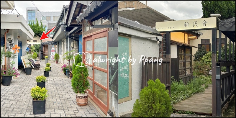 카페신민회는 뒷문이 있다. 월명동 행정복지센터 쪽으로 '도시재생홍보골목길'이라는 참 재미없는 이름의 골목길이 있는데, 볼거리는 좀 있다. 예전의 골목길을 재현 하였는데 골목 입구에는 히노키잠게스트하우스가 있고, 나무 전봇대, 김기옥 주택을 지나 골목 끝에 카페신민회를 만난다.