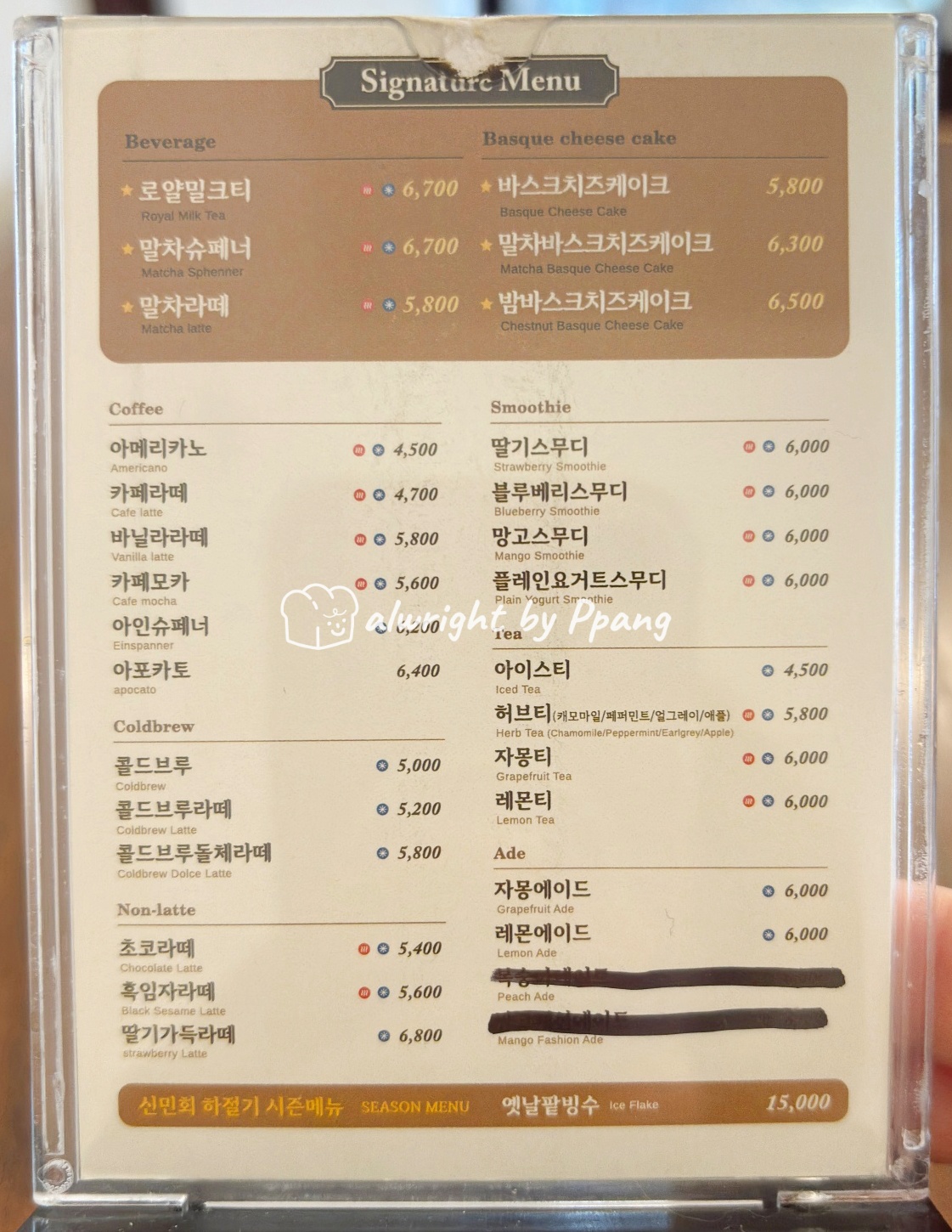 시그니처 음료는 로얄 밀크티, 말차슈페너, 말차라떼이고 바스크치즈케이크, 말차바스크치즈케이크, 밤바스크치즈케이크를 주문하는 사람이 많았다.