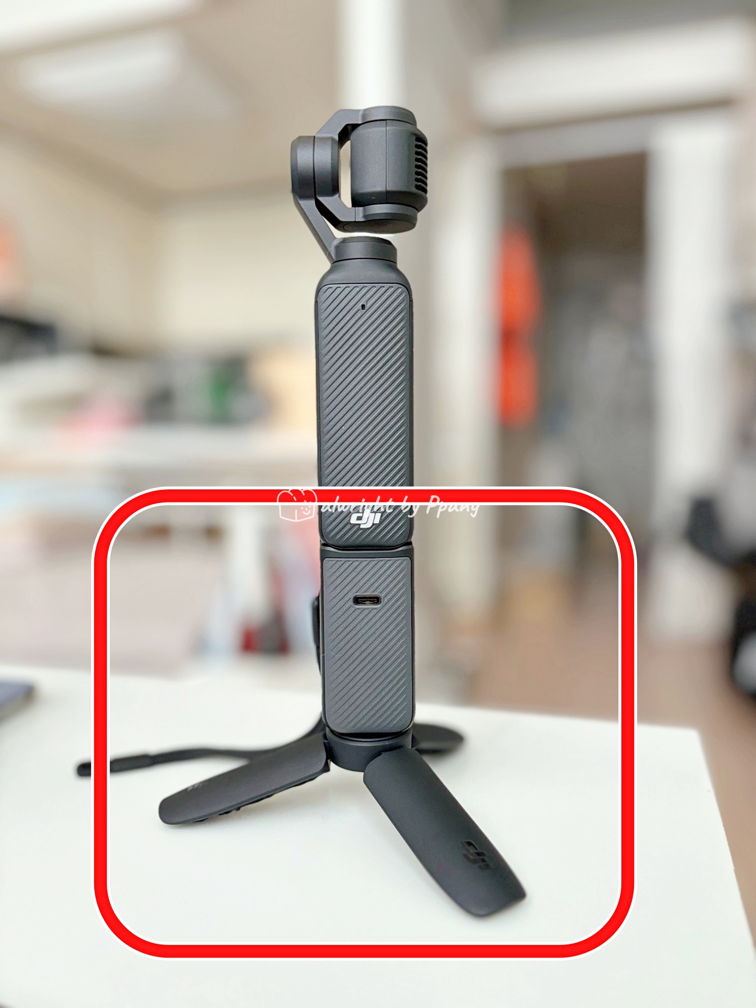 손잡이를 연결하면 여길 통해 충전을 하거나 삼각대를 연결할 수 있는데 보조배터리도 마찬가지이다. 두개의 길이가 약 두배 정도 차이가 나면서 보조배터리와, 삼각대까지 붙이게 되면 키가 꽤 커진다.