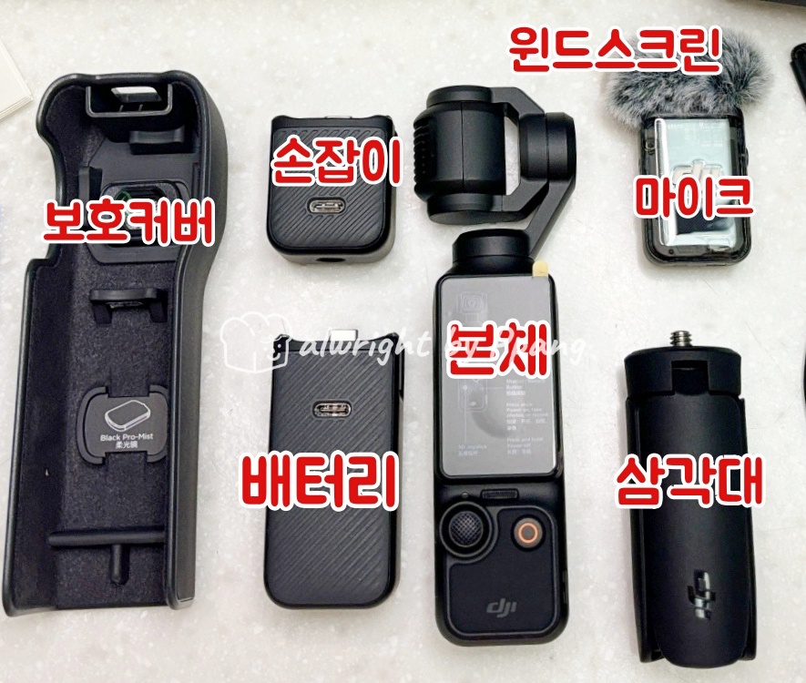 오즈모 포켓3 단품과 크리에이터 콤보 차이를 확인하기 위해 단품 구성을 말하자면, 단품 구성은 본체, 커버, 손잡이, 스트랩, C to C 라인이다. 그리고 세트에는 파우치, 마이크+윈드스크린, 보조배터리, 와이드렌즈, 미니 삼각대가 있다.
