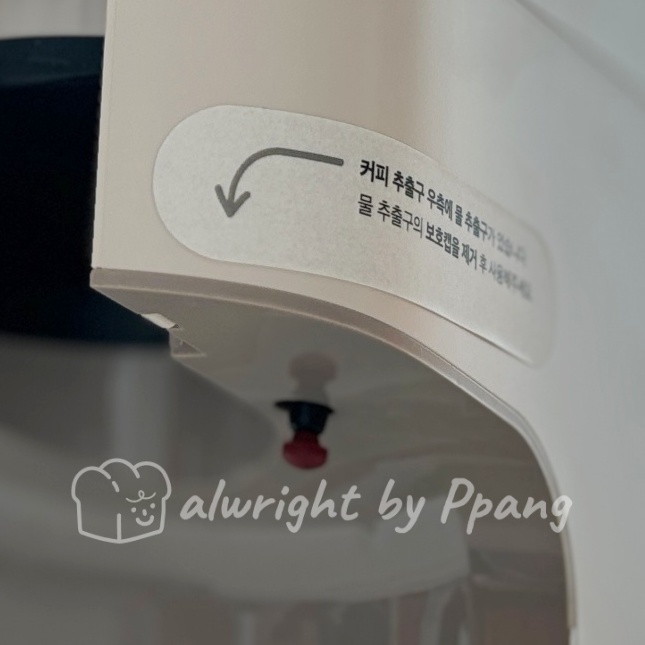 커피가 추출되는 쪽 옆으로 요러한 작은 구멍이 있는데 이건 물 나오는 구멍이다. 3개의 버튼, 즉 에스프레소, 롱고, 아메리카노가 있는데 아마도 아메리카노를 선택하면 에스프레소와 함께 물이 나오는 출수구이다. (이 기능은 아직 사용하지 않음)