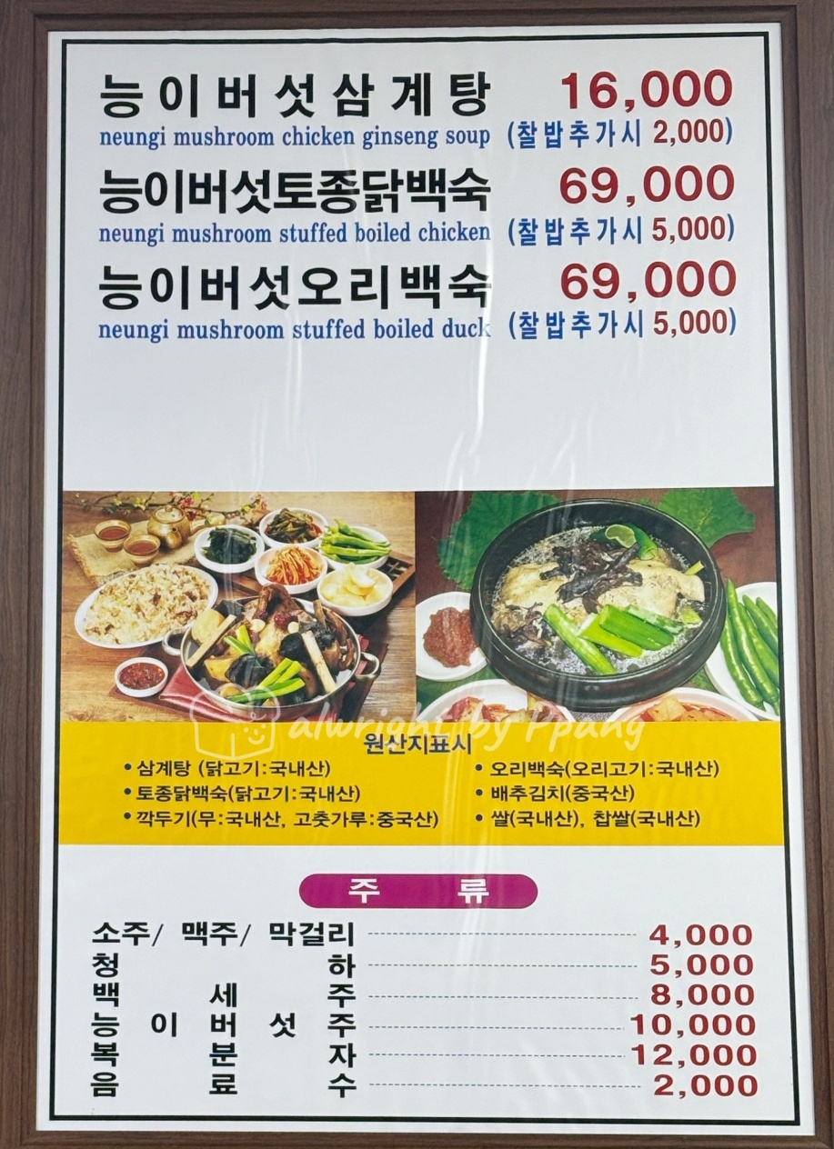 이 집은 능이버섯백숙집이다. 근처 주민들과 직장인들에게 인기가 많아 오픈부터 대기가 시작되는 곳이다. 우린 앞에 있는 횡단보도에 서 있다가 타이밍이 좋아 보여 행선지를 급 선회, 기다리지 않고 입장했다. 역시 맛집 이즈 타이밍. 나중에 알게 되었지만 이건 정말 행운이라며.