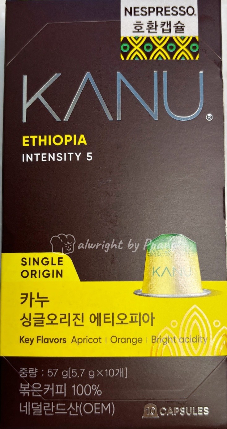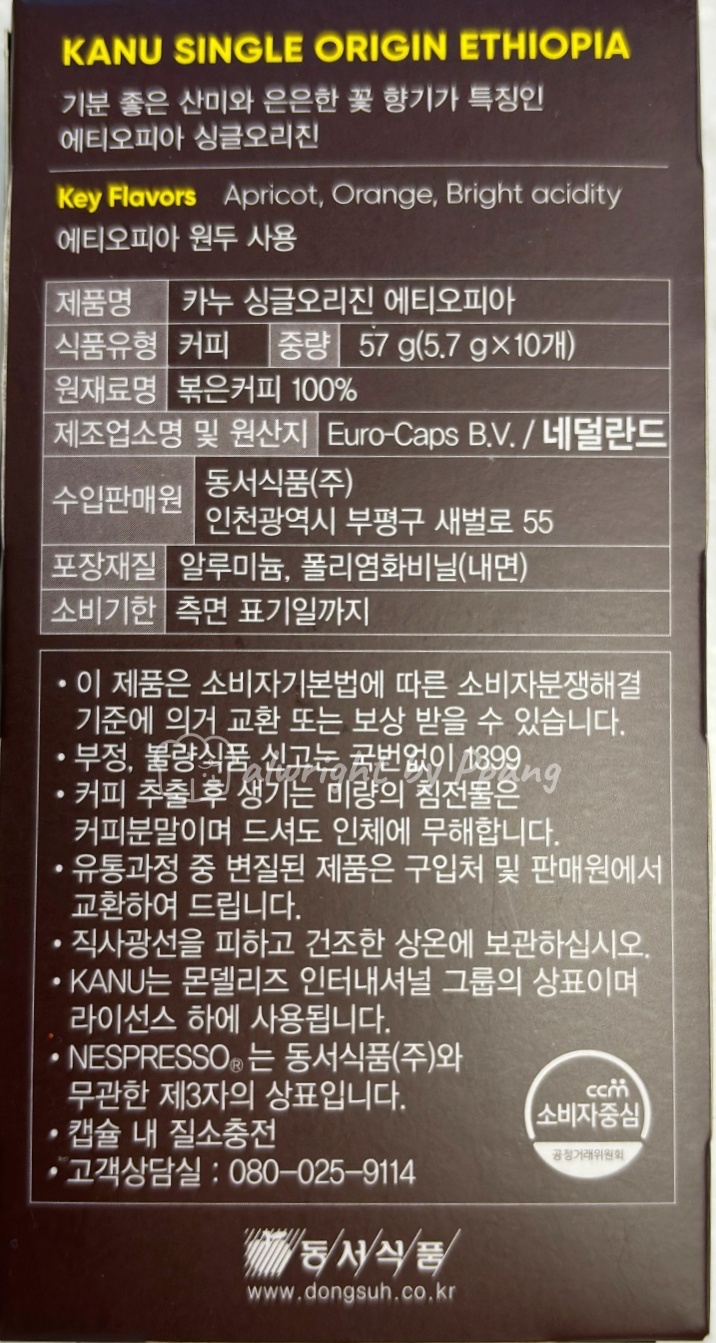 원두는 콜롬비아인데, 생산은 네델란드 산이고, 국내 판매 회사는 우리나라네요. 네스프레소 호환 캡슐의 경우 5.7g 들어 있어요.