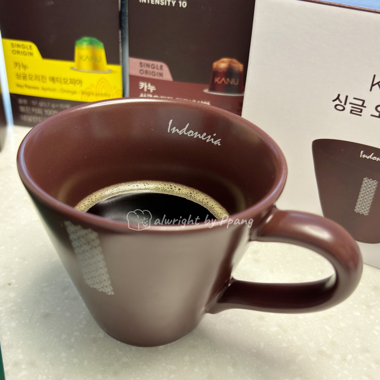 여튼 인도네시아 캡슐로 한잔 내려봤습니다. 싱글 오리진 머그잔이라고 하는 이유를 알겠어요. 삼각뿔 모양으로 생겨서 커피양은 종이컵 분량 정도 나오는 것 같아요.
