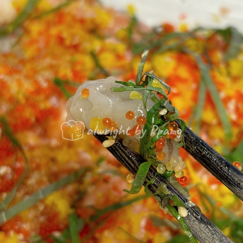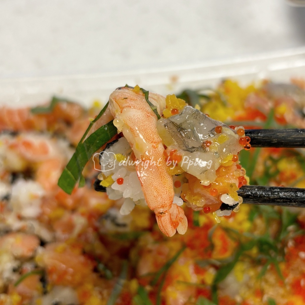 코스트코 일산지점의 지라시스시는 연어를 많이, 새우, 낙지 약간, 그리고 날치알을 아쉽지 않게 올렸다. 와중에 연어알도 툭툭 숨어있다. 깼잎은 위에, 밥 아래에는 김가루가 있다.