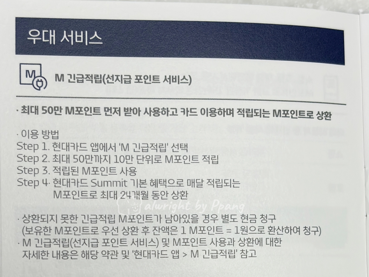 이건 자동차 살 때 포인트 땡겨 쓰는 거랑 같은 원리이다. 50만 M포인트를 먼저 받아 사용하고 카드 이용에 따른 포인트를 가져가겠다는 말이다. 그니까 땡겨받은 만큼 카드를 열심히 써서 상환하던가, 그게 안되면 돈으로 내면 된다. 포인트 빚이다.