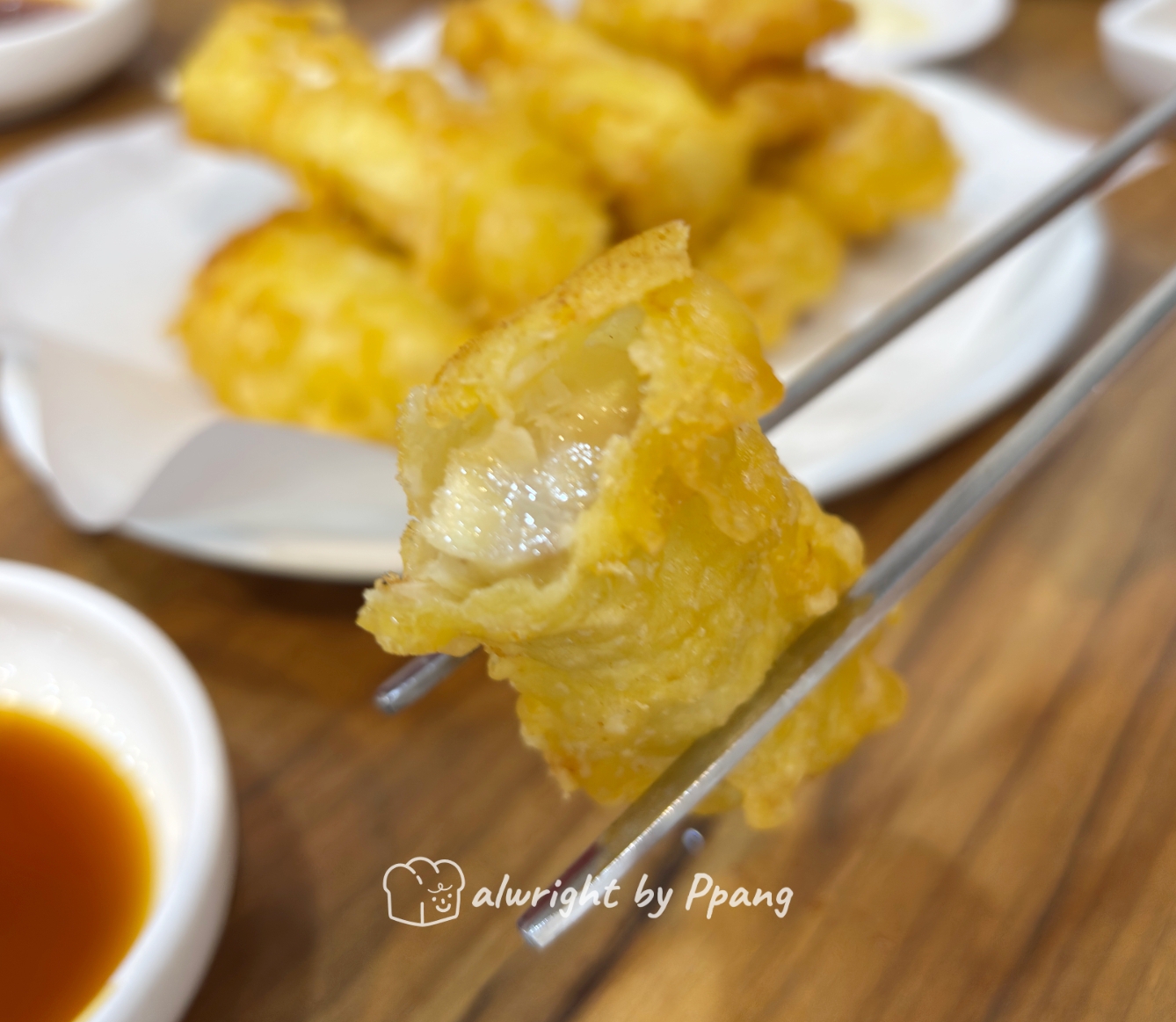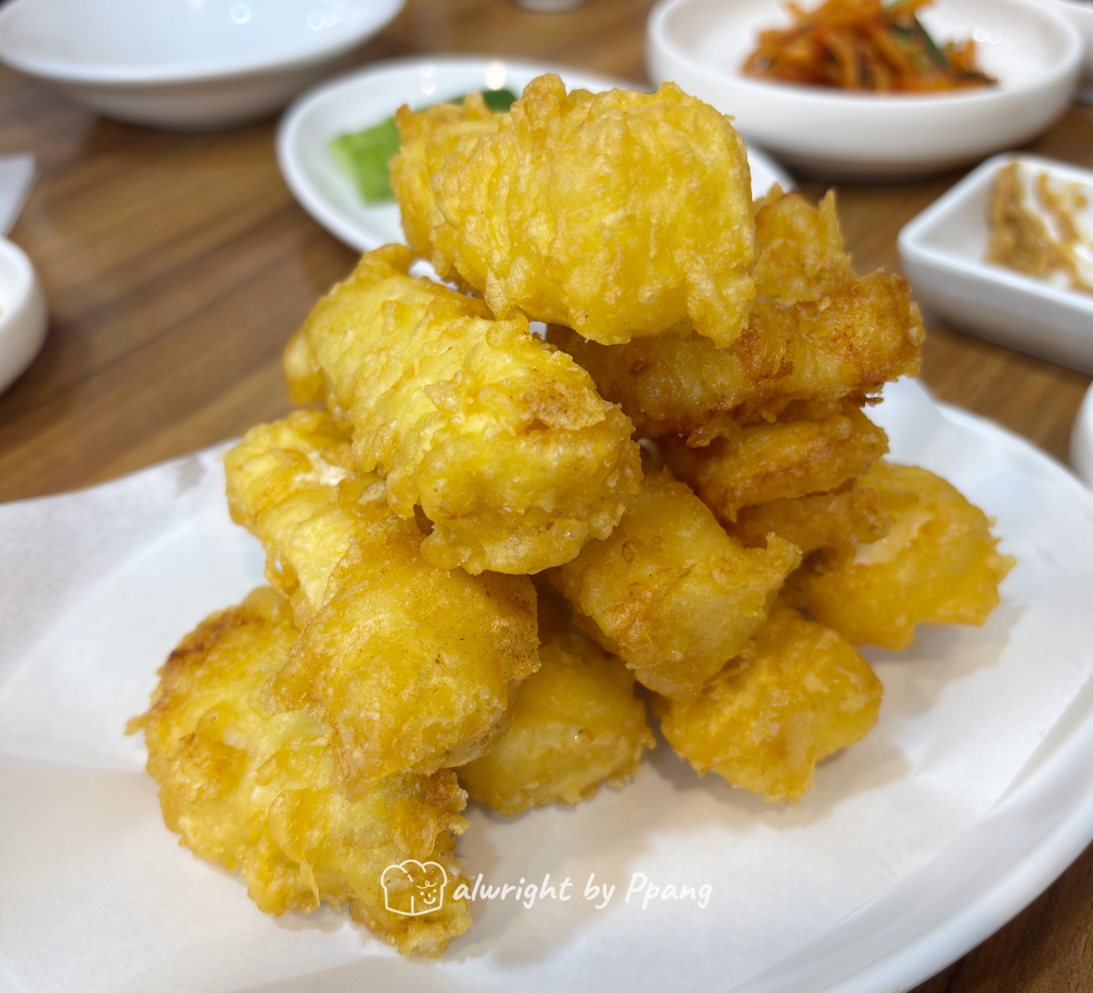 혜화칼국수의 생선튀김은 플레이팅도 한 몫한다. 넓게 펴지 않고 피라미드 처럼 쌓아올린 생선튀김이 푸짐해 보이기도 하고, 뭔가 도전의식?을 불러 일으키며 함께 먹는 사람과 눈치작전도 은근히 하게 되는 듯.... 여튼 위에서부터 얌전히 하나씩 소진하게 된다. 흰살생선을 잘 발라서 두툼하고 화려하지 않은 얇은 튀김옷을 입고 있다. 가시는 조심해야 한다.