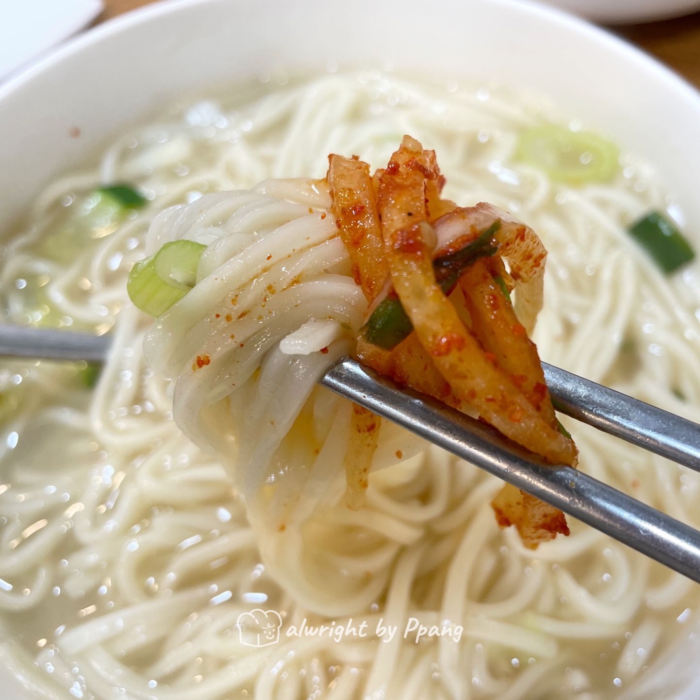 혜화칼국수에서 국시는 디폴트다. 면의 굵기는 칼국수치고는 조금 얇은 듯한, 국시면이다. 국물은 사골을 진하게 우려냈다. 안동국시라고 하는 경상도식 국수인데, 이건 호불호가 갈리는 음식이기도 하다. 사골국물 특유의 쿰쿰한 육향이 싫은 사람에게는 잘 맞지 않는다. 난 예전에는 굉장히 좋아했고, 지금은 식성이 많이 바뀌어서 낫베드 정도, 물론 이 집 잘한다. 내 취향이 조금 바뀐 것 뿐이다.