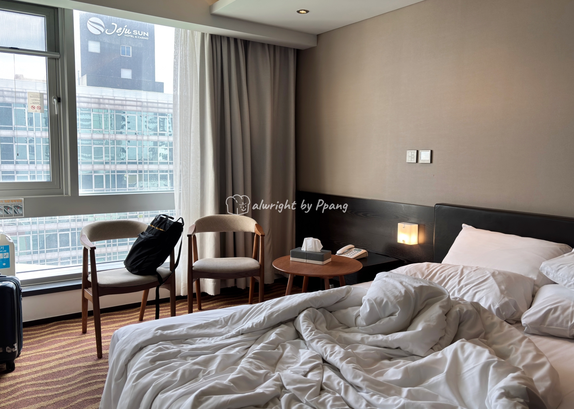 가장 작은 더블룸으로 예약 했는데 방 크다. 더블 침대도 크다. 나는 가장 저렴한 방을 예약 했기 때문에 앞으로는 선 호텔이 있다. 그러니까 내 객실은 건물 옆구리 방향(동쪽)에 위치하고 있다.