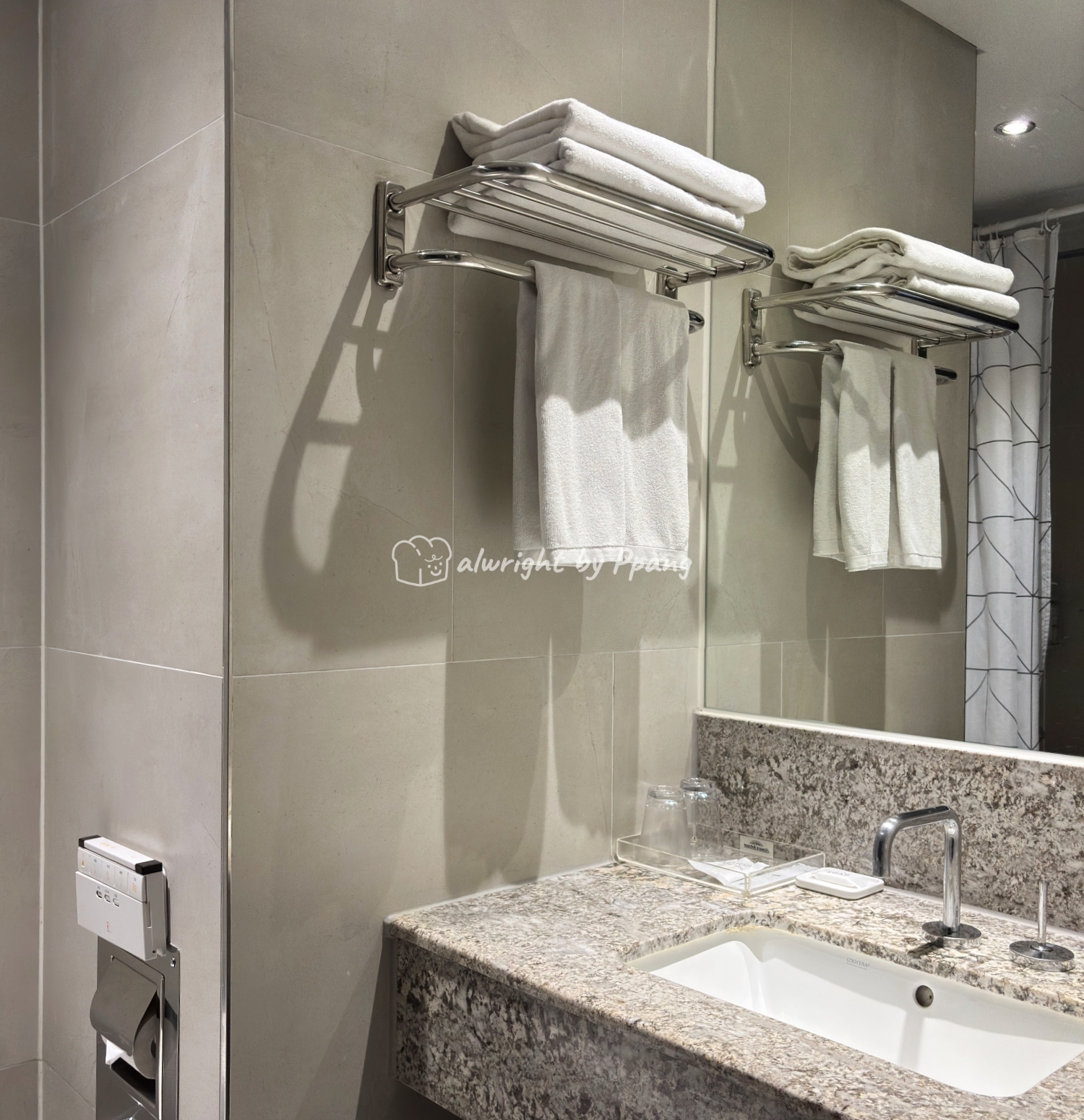 여튼 그런 면에 있어 화장실 세면대에 대리석이 적용되어 있고, 공간도 넉넉하다. (객실에는 카펫이 깔려 있지.)