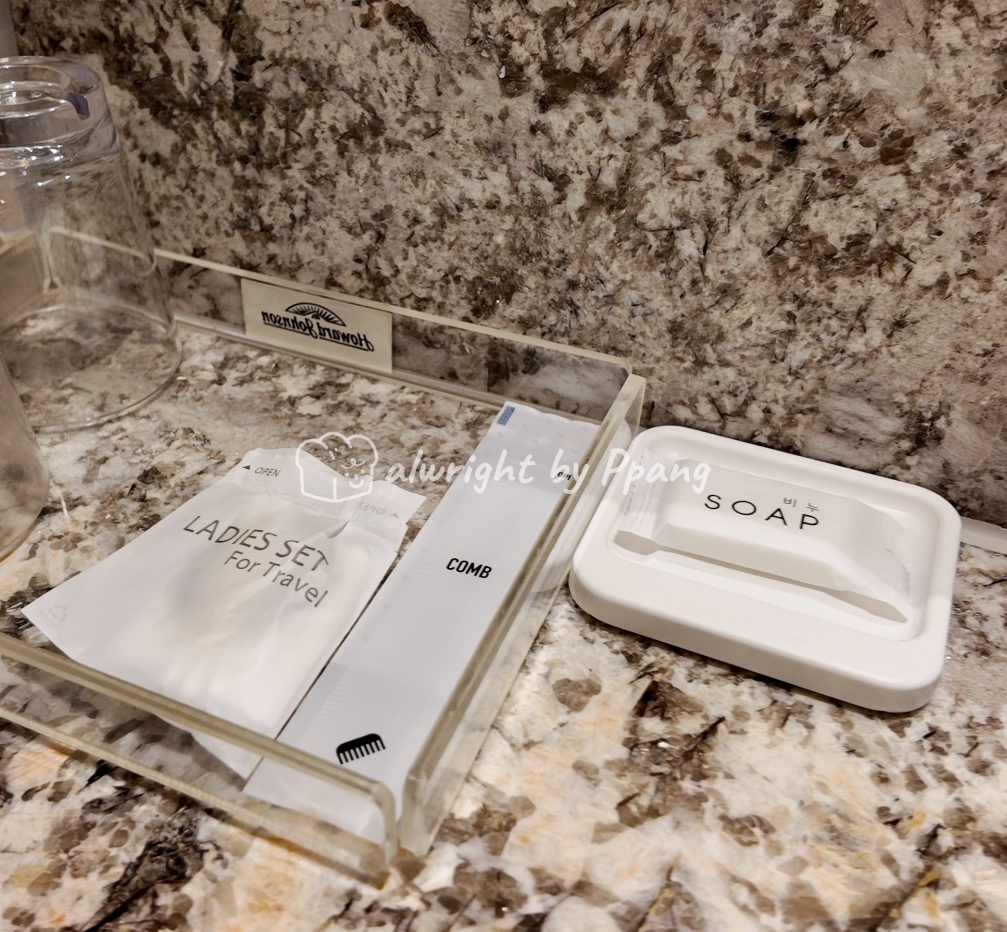 4성급이니까 정책에 따라 치약, 칫솔은 없고, 화장솜, 고무줄, 빗, 비누는 있다.