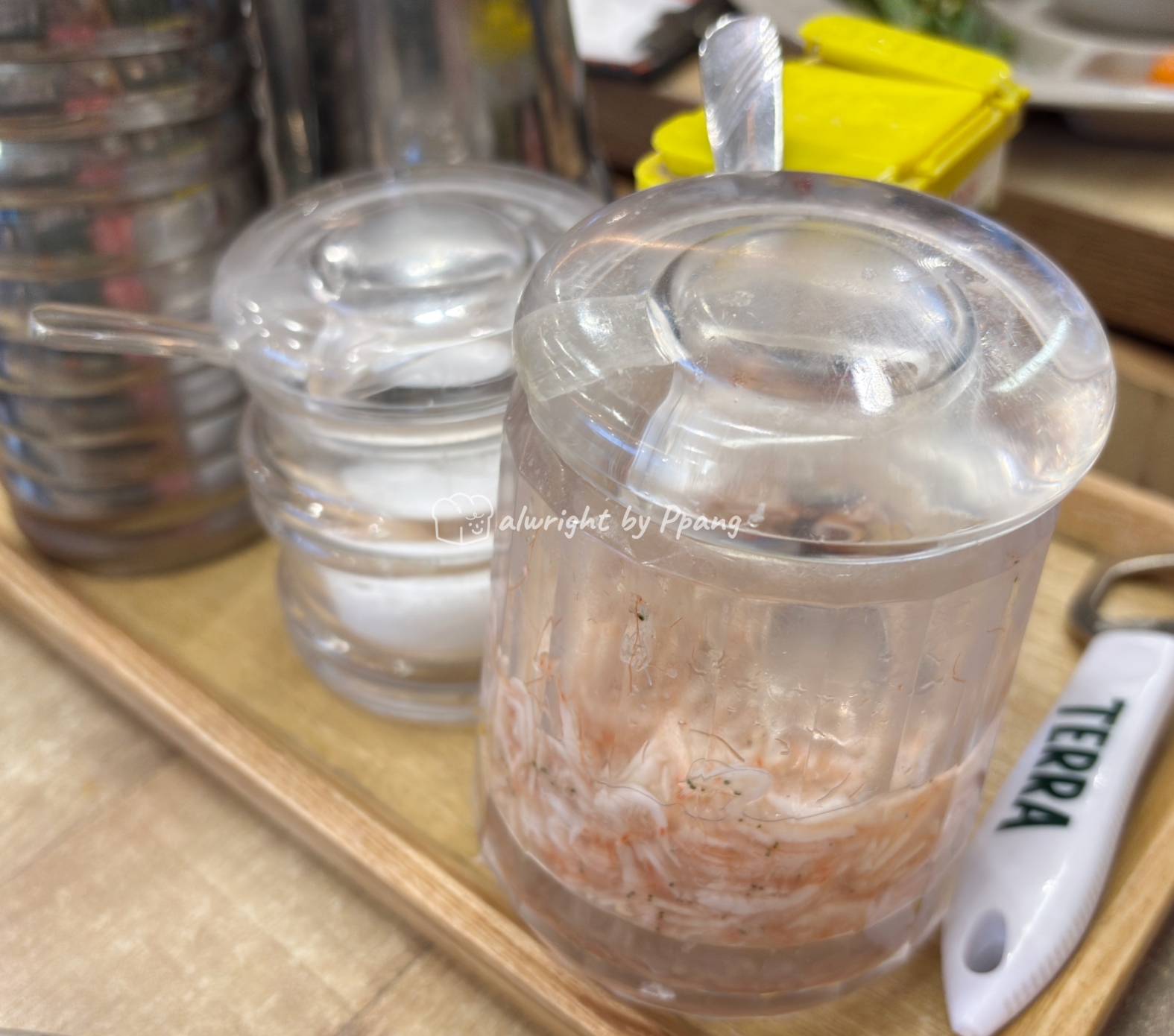 식탁에는 새우젓과 소금, 후추가 기본으로 있고, 물컵과 오프너도 있다. 수저도 알아서 놓고 기다리다 보면 밑반찬부터 나온다.
