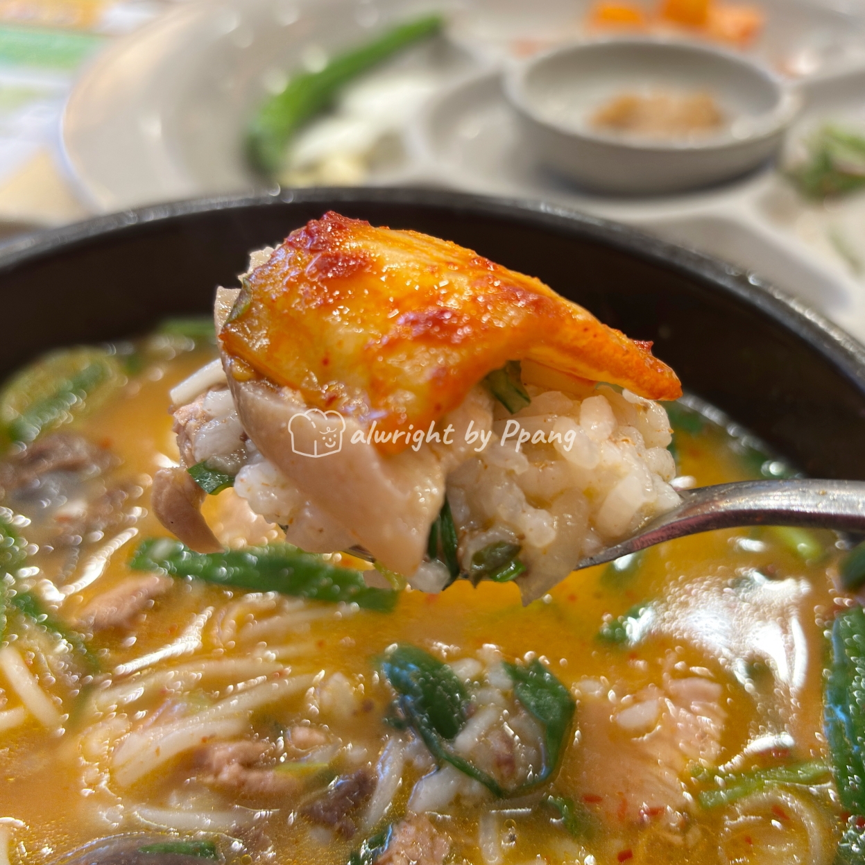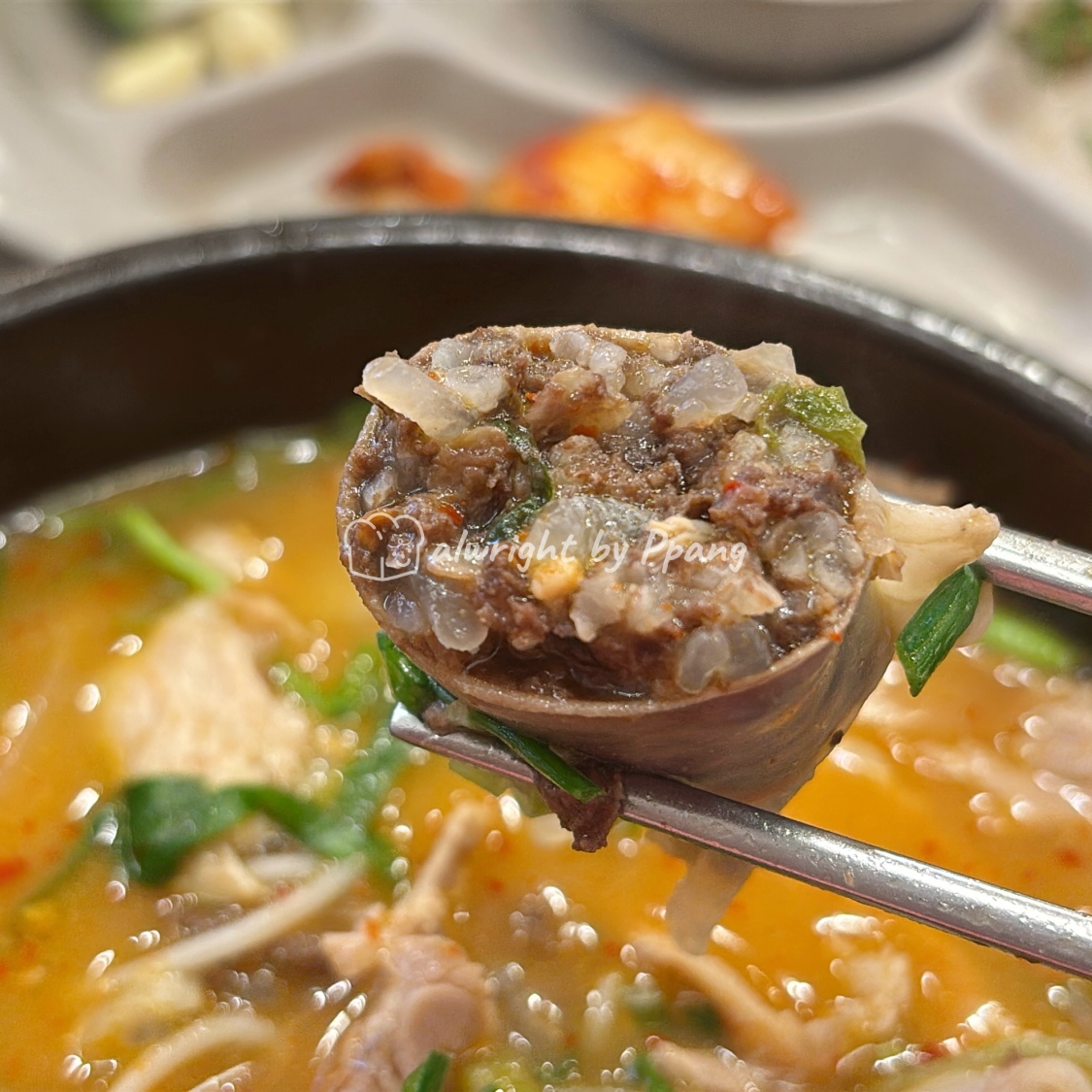양념순대라 국물에 풀리면 더 걸죽해지면서 양념이 섞이겠지만 걍 순대 자체로 먹는 게 더 좋다. 그러니까 취향대로라면 돼지국밥이나 내장국밥에 순대를 따로 주문하는 게 맞다. 다 먹기엔 배가 부르니까 이렇게 먹는다.