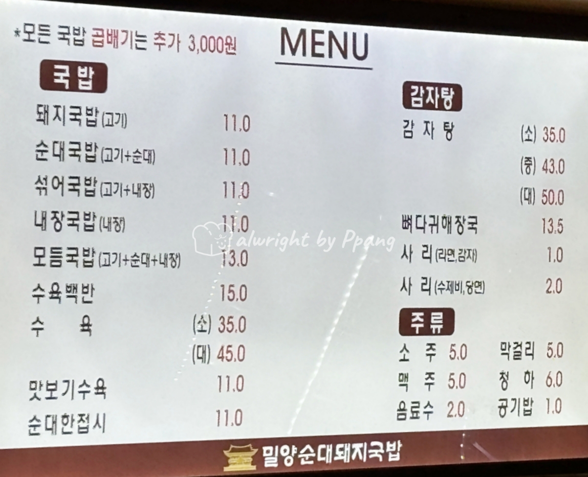 순대국, 감자탕도 함께 하고 전국적으로 지점이 있는 체인점이다. 그러고 보니 부산에 와서 밀양 거를 먹었네.