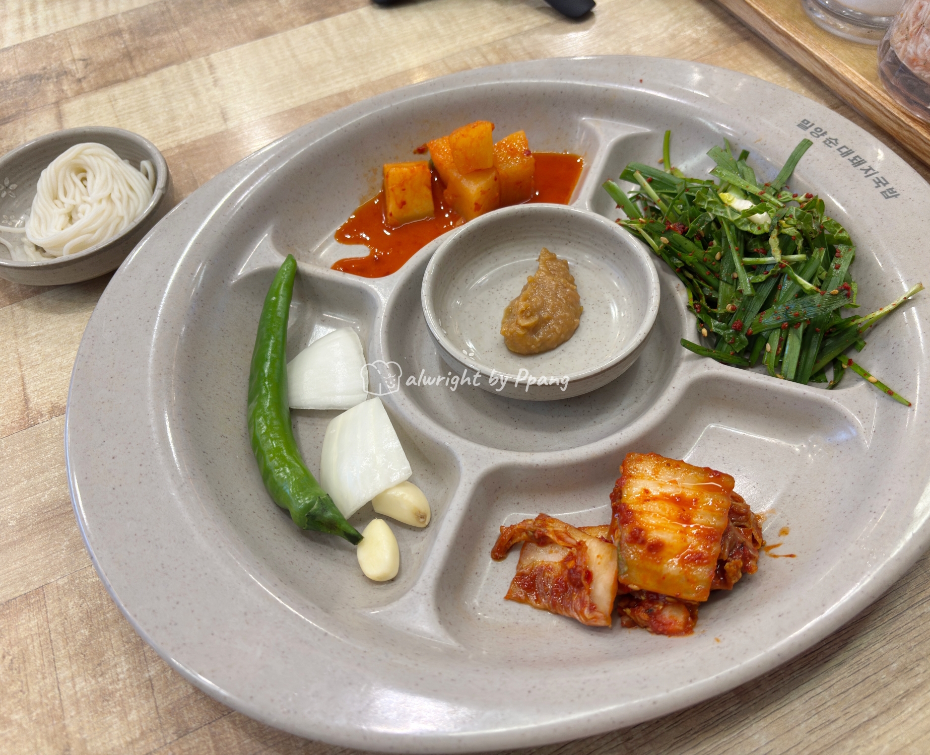 둥근 트레이에 나오는 실속형 반찬 세뚜, 소면도 약간 나온다.