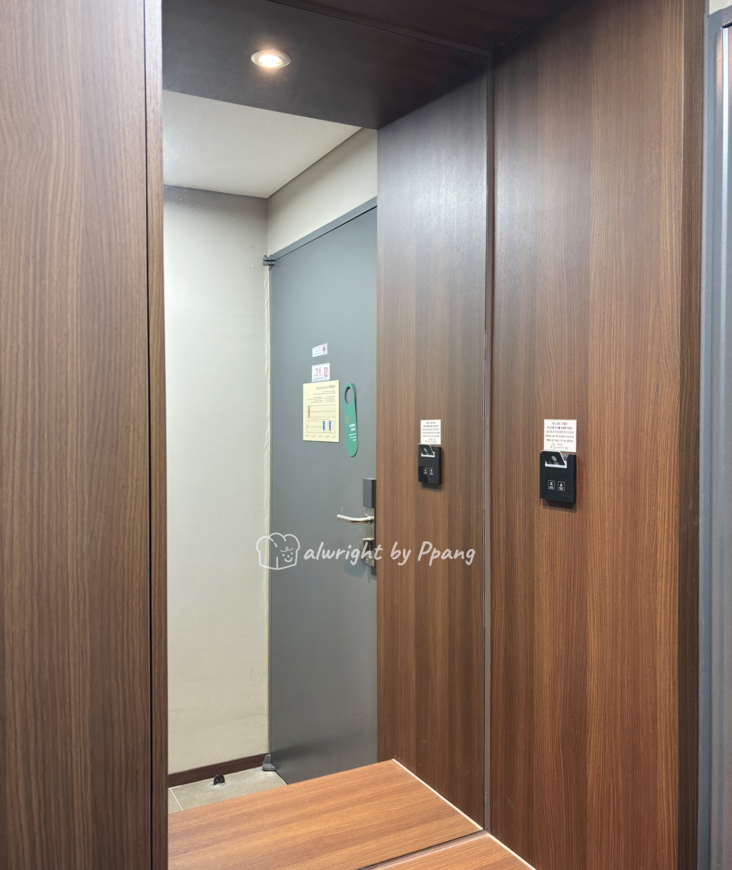 현관에 트렁크 올릴만한 공간이 있고, 이어서 옷장과 금고가 있고, 이어서 냉장고와 수납공간이 있다. 화장대 공간이 좁은대신 옷장, 수납이 넉넉한 편이다.