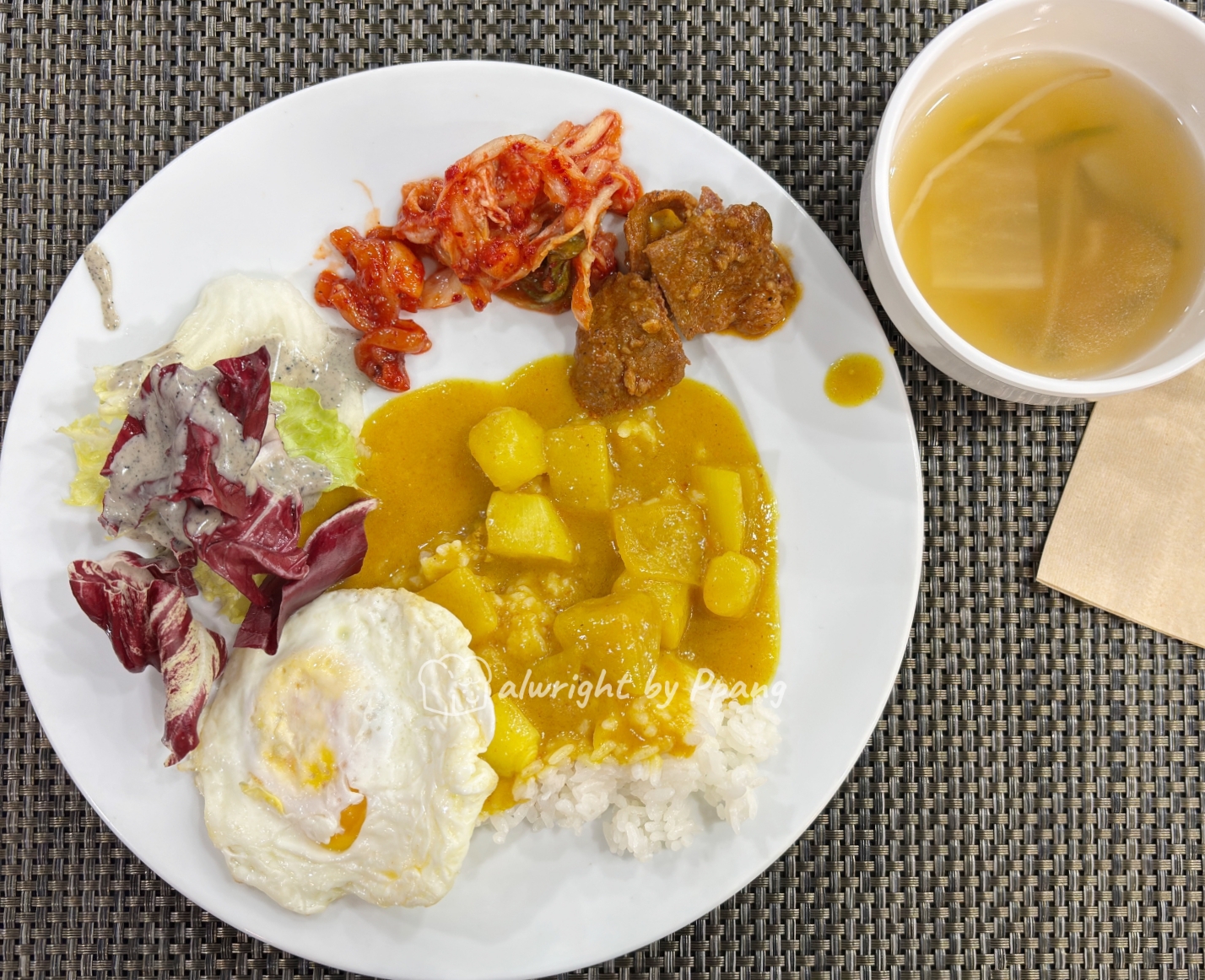 토스트나 먹으려고 했으나 왠일, 급식 분위기루다 커리 올리고 계란 후라이까지 먹먹.. 샐러드는 집에서 하두 먹어서 나가서 잘 안 먹는데 두번 떠 먹음.. 그런데 저게 적채가 아니고 새로 알게 된 품종인데... 적채 비슷한데 조금 더 부드러운... 식감이 양배추와 양상추 사이랄까...? 뭐 였더라...?... 이름을 까 먹..
