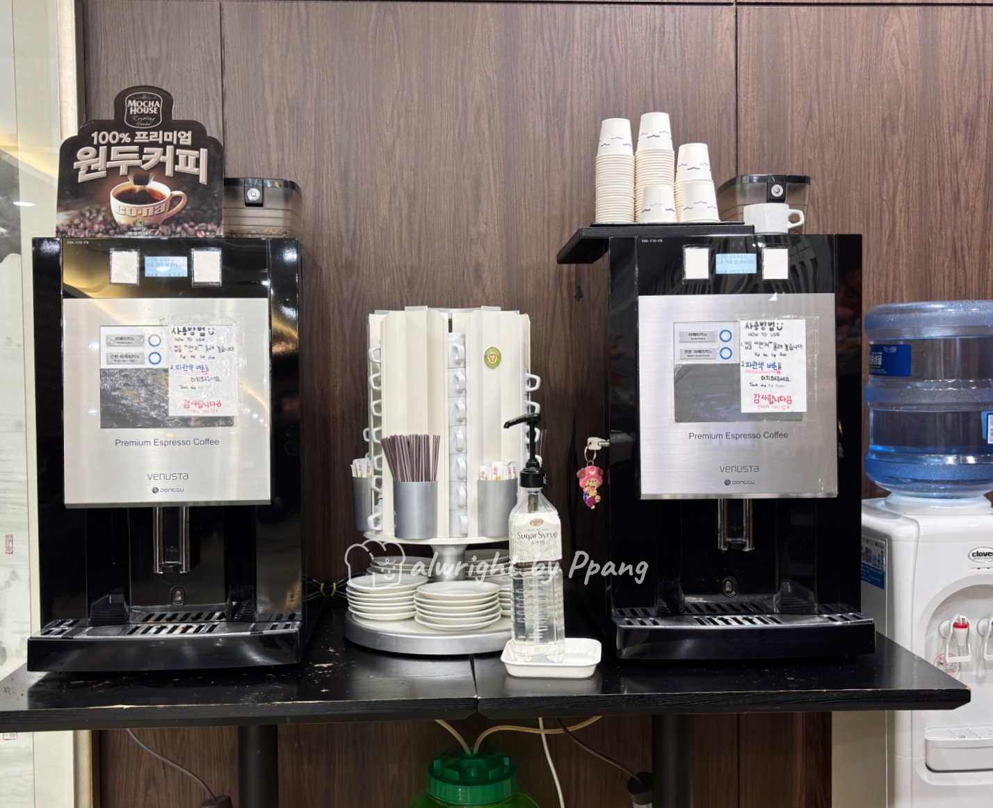 배식 테이블 쪽에는 커피믹스, 녹차가 있고, 출입구 쪽에 커피머신이 있다. 커피도 맛이 괜찮았다.