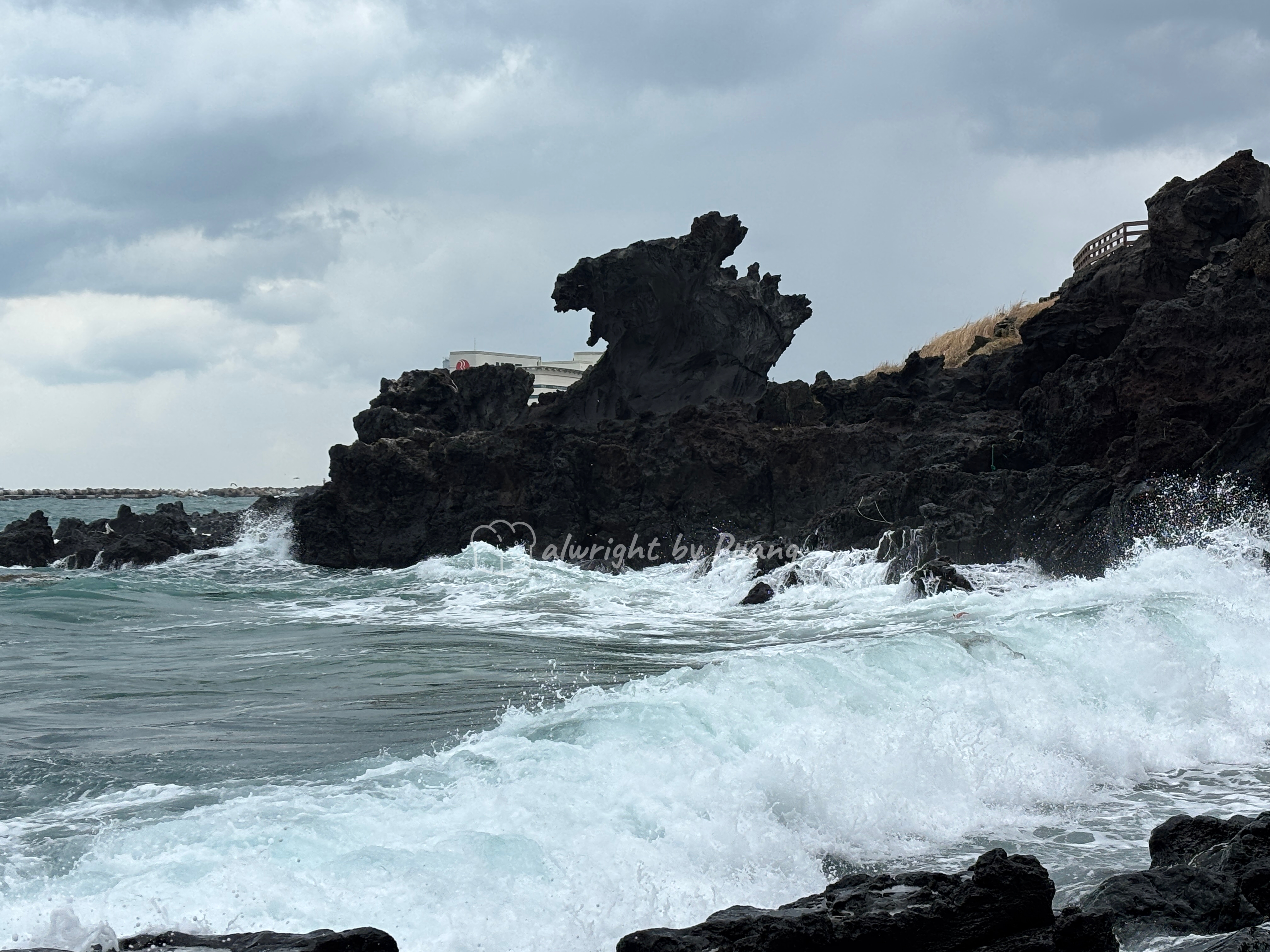 제주는 날씨 안 좋을 때 오션뷰가 살짝 실망스럽다. 내 생각에 흐리고 바람 부는날이 어울리는 유일한 바다는 용두암이다. 단, 바람이 더 거세어 진다면 바닷가로 내려가면 안된다.