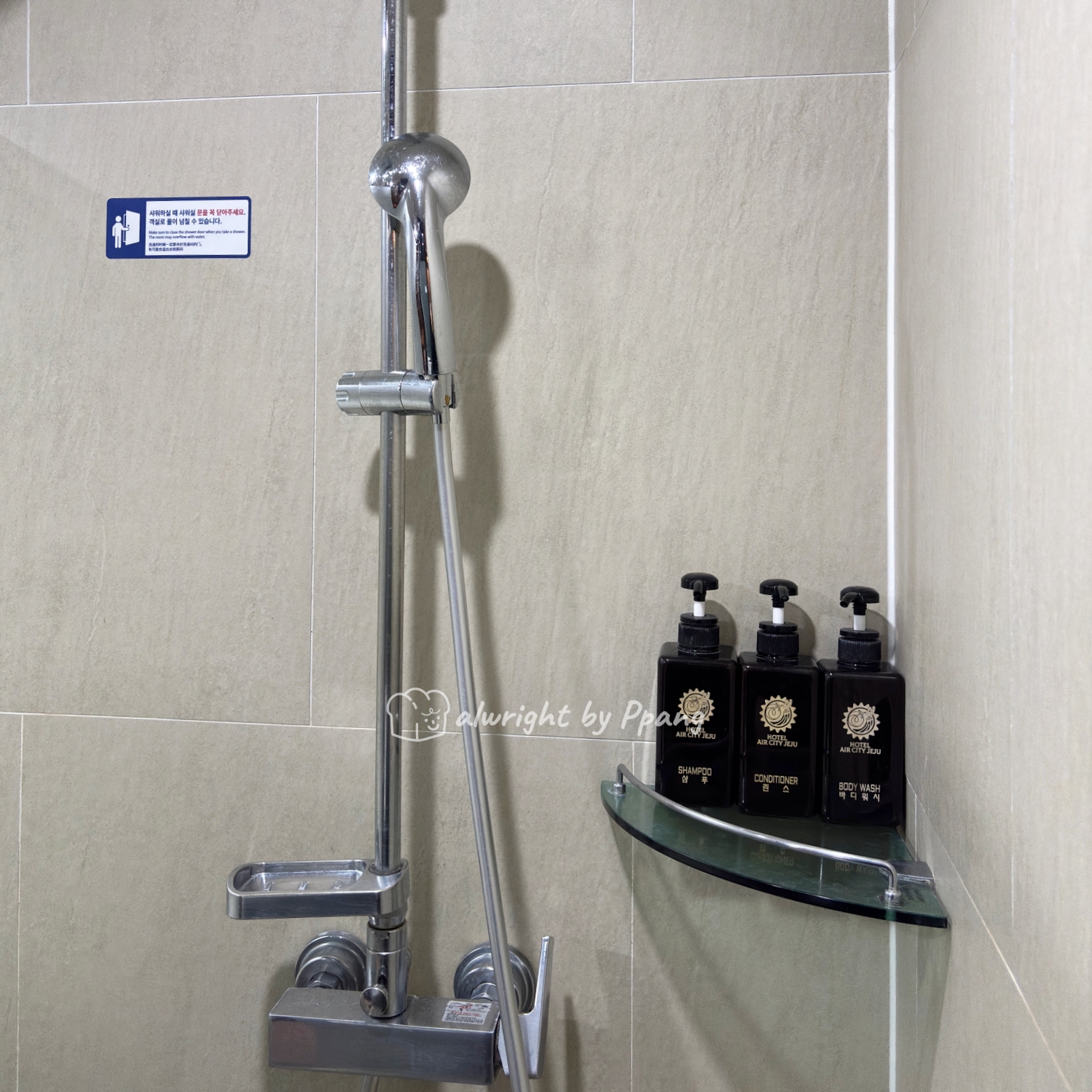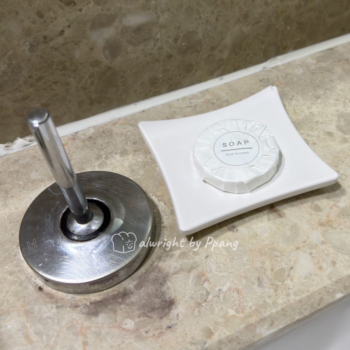 샤워룸에 샴푸, 컨디셔너, 바디워시가 있고 세면대에 비누 있다. 치약, 칫솔은 없다.