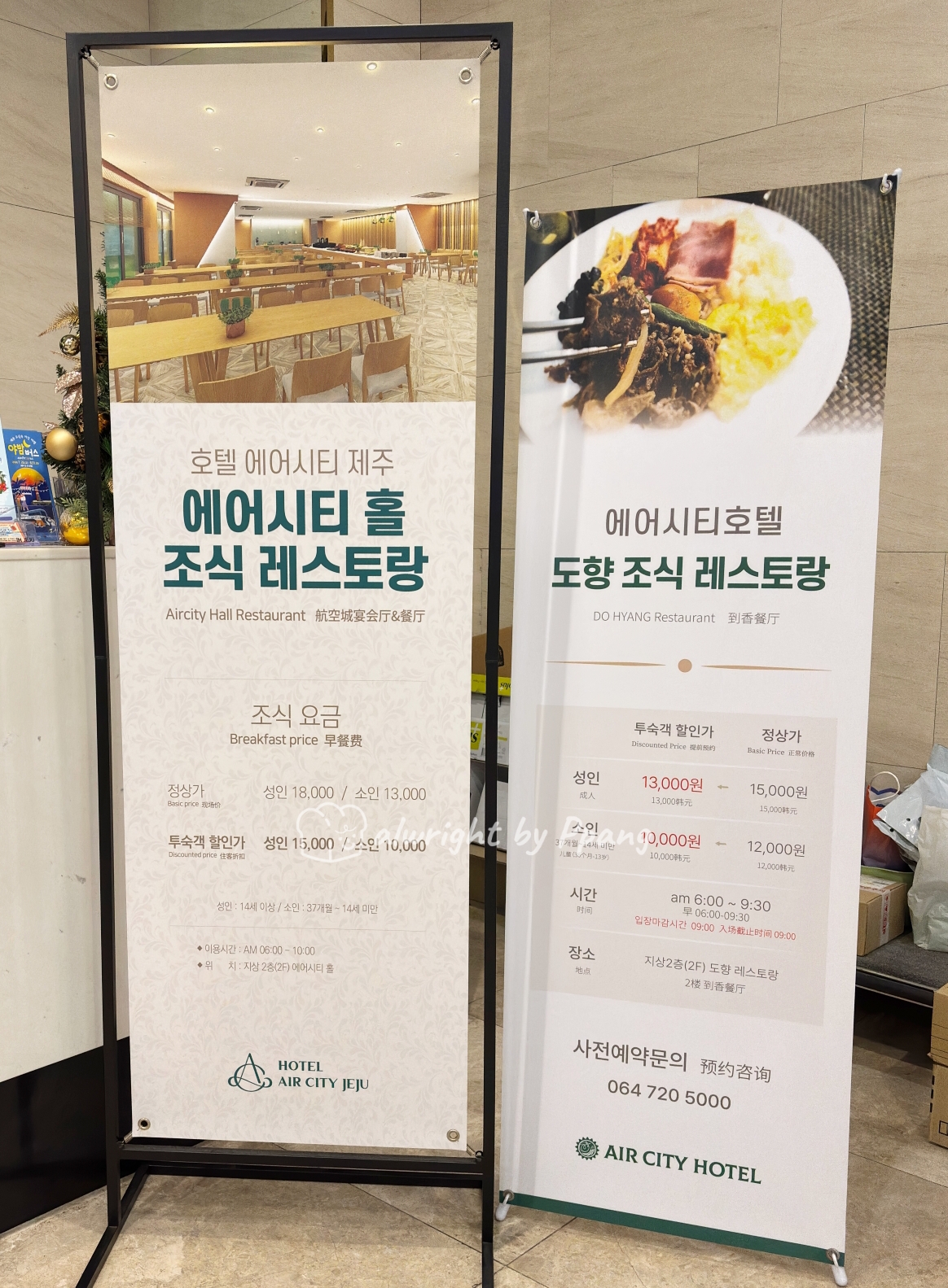 가격은 에어시티홀이 정가 18,000원 인데 투숙객의 경우 15,000원에 할인되고, 도향은 정가 15,000원인데 투숙객은 13,000원에 할인해 준다.