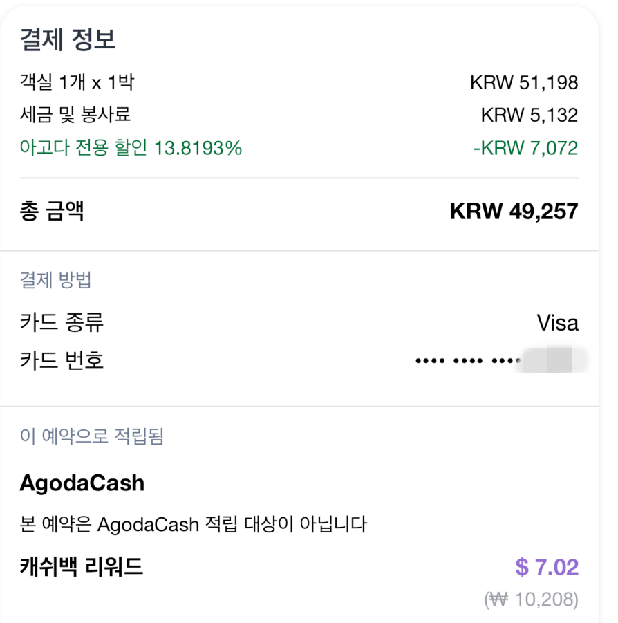 나는 디럭스 트윈룸을 아고다 평일가로 49,257원에 예약하고 다녀왔다. 그런데 이게 캐쉬백 적용되는 예약이라 7.02 달러 돌려받을 예정이다. 그럼 3만원대에 다녀온거네? 가성비 뭐야...새삼 대박이네.