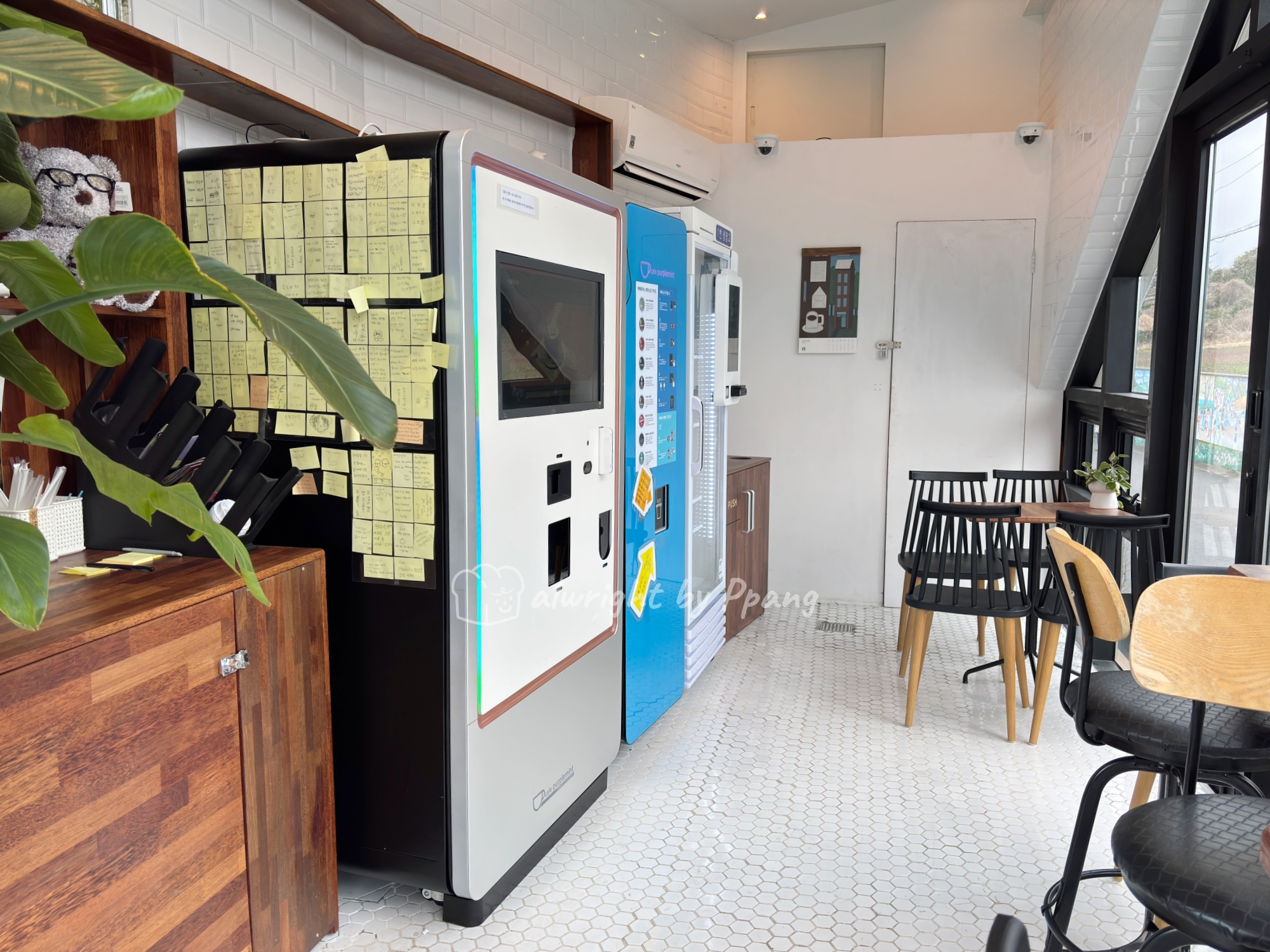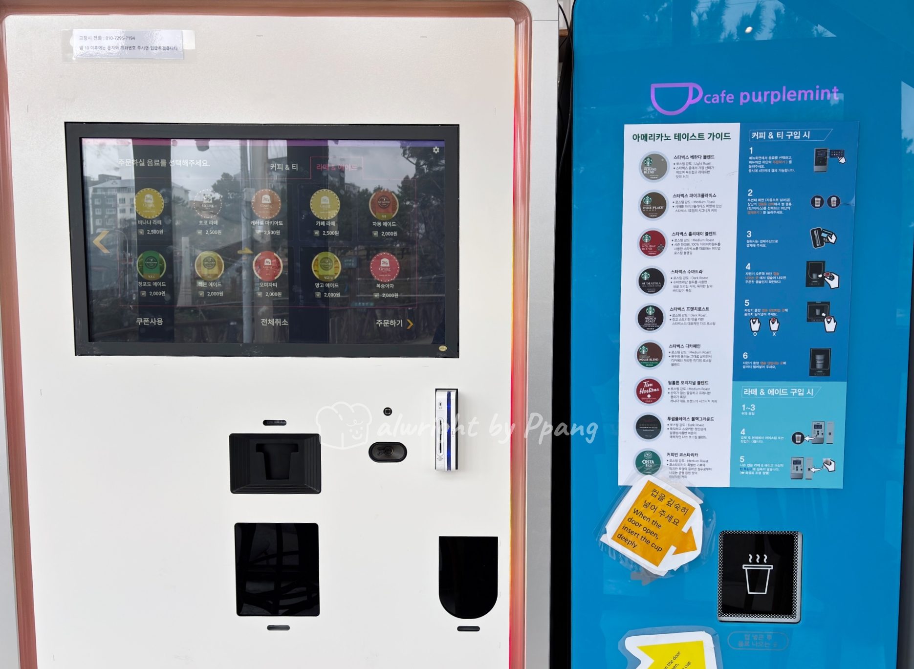 하얀자판기는 아메리카노, 파란자판기는 라떼, 에이드류를 만든다. 즉 라떼, 에이드류는 두개의 자판기를 모두 사용한다. 흰 자판기에서 주문하고 결제하면 캡슐이 나오고, 아이스와 라떼류는 해당하는 컵이 나온다. 파란색 기계에 캡슐 넣고, 컵 넣고 추출하면 된다.
