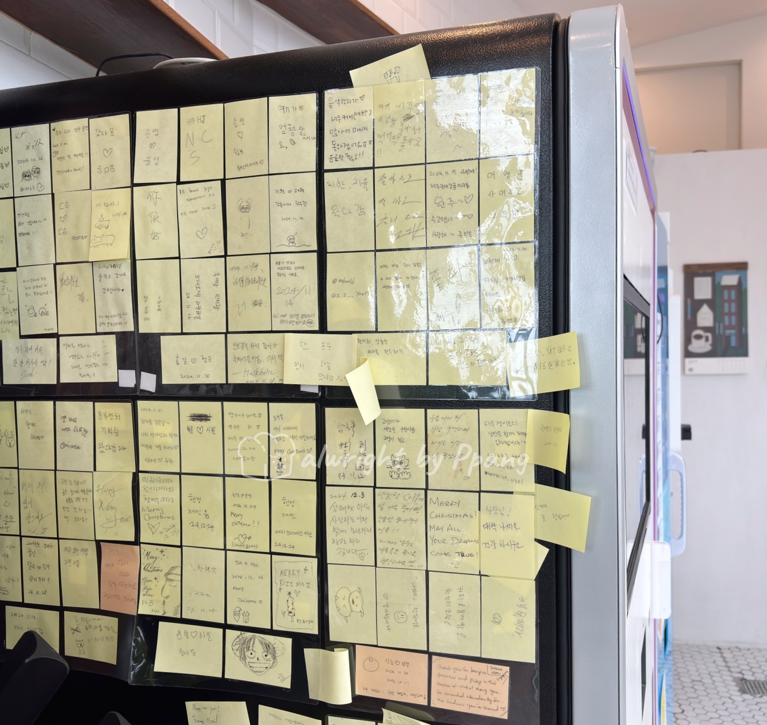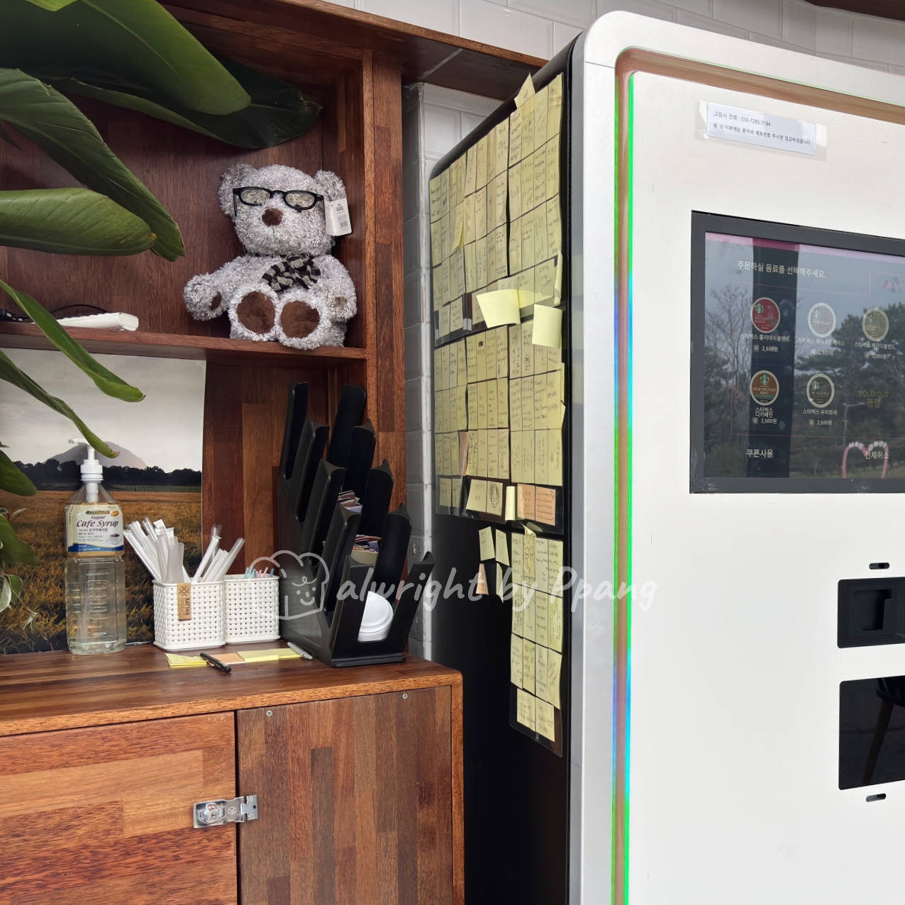 커피를 가져갈 수 있도록 손잡이와 뚜껑이 준비되어 있다. 시럽도 있고, 빨대도 있고, 소감문 작성을 위한 포스트잇도 있다..ㅎ.. 다들 내 맘 같았는지 후기들을 남기고 가셨다.